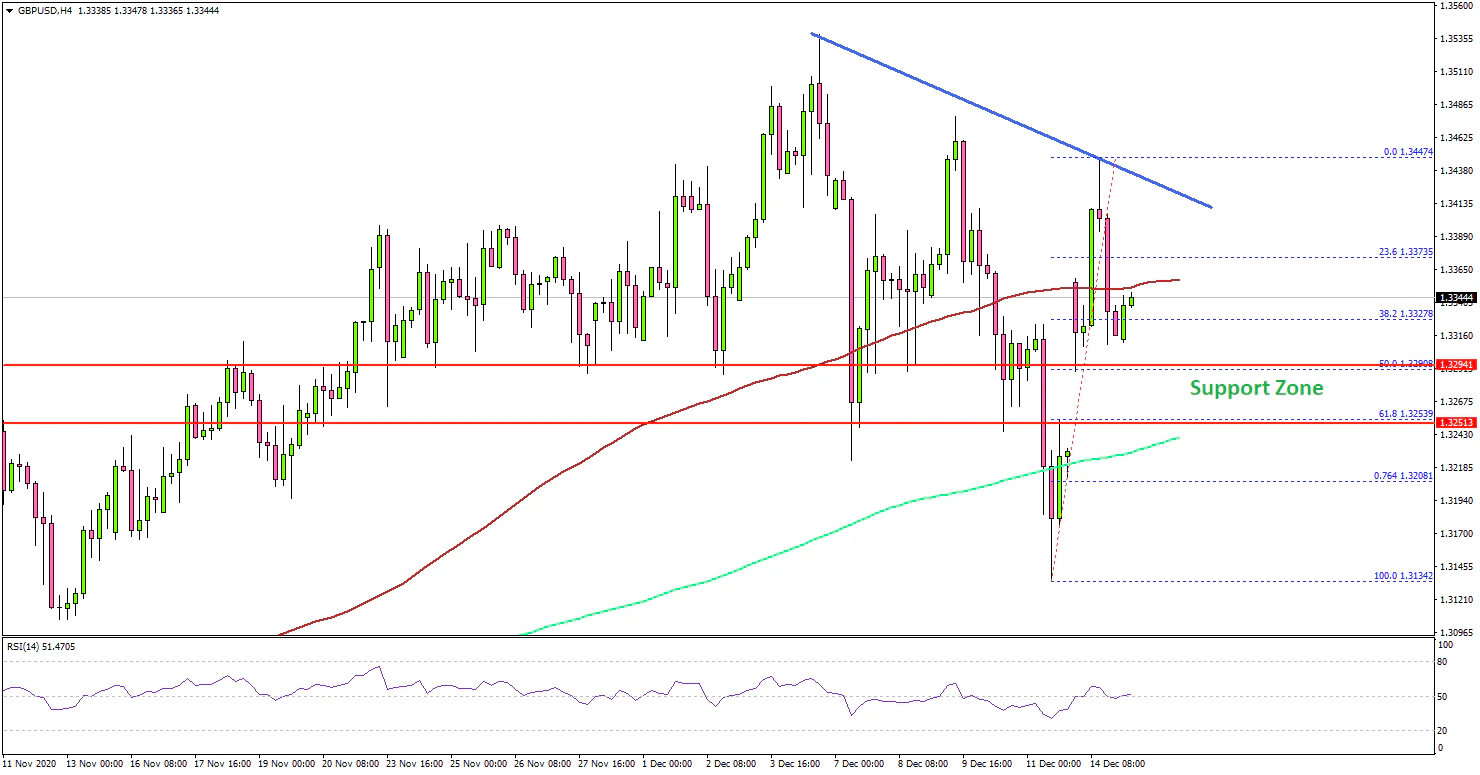Conversely, the pair could correct lower below the 1.3320 support. There is a major support forming near the 1.3260 level (a multi-touch zone). If there is a clear break below the 1.3260 and 1.3250 support levels, there is a risk of a sharp decline.