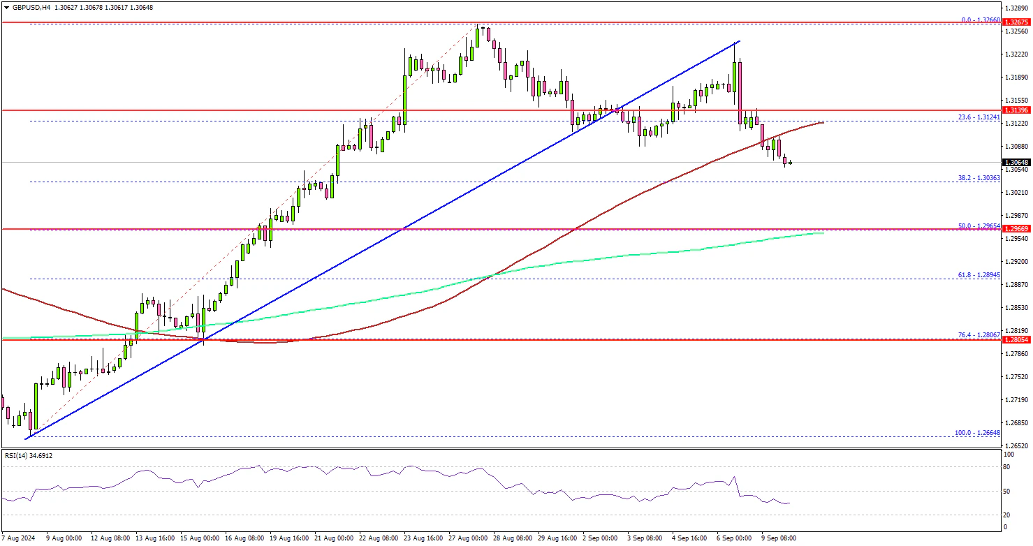 • It traded below a key bullish trend line with support at 1.3140 on the 4-hour chart.
