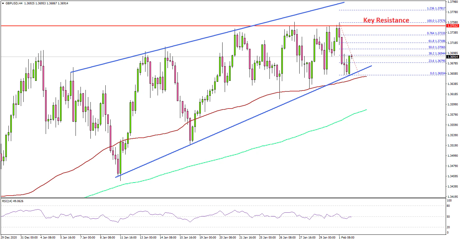 Looking at the 4-hours chart, the pair faced a strong selling interest near the 1.3750 and 1.3760 levels. A high is formed near 1.3758 and the pair corrected lower. There was a break below 1.3700, but the pair remained well below 1.3630 and 1.3620.