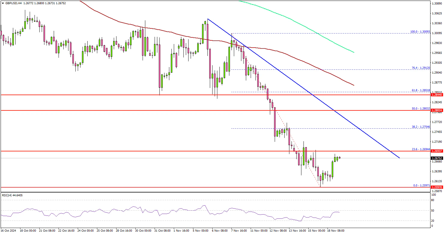 Looking at the 4-hour chart, the pair settled below the 1.2700 level, the 100 simple moving average (red, 4-hour), and the 200 simple moving average (green, 4-hour). Finally, the bulls appeared near the 1.2600 support zone.