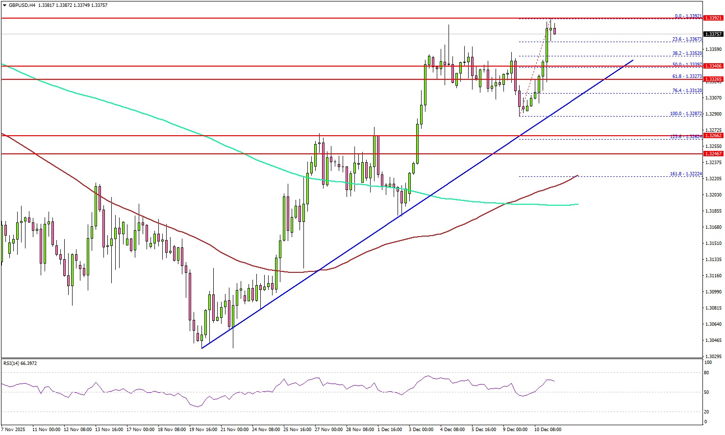 There is also a key bullish trend line forming with support at 1.3325. Immediate resistance sits near 1.3390. The first key hurdle is seen near 1.3400.