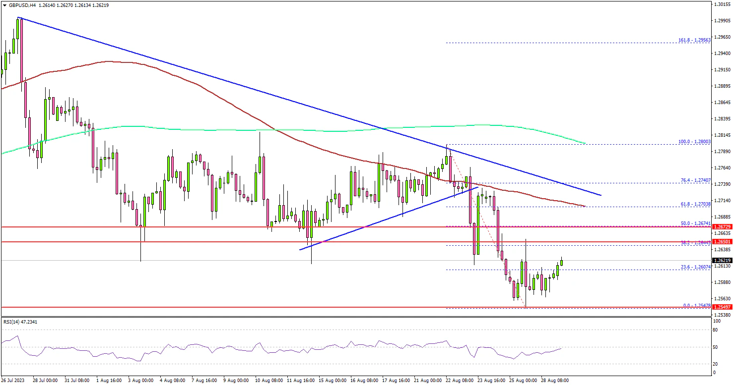 The pair tested the 1.2550 zone. A low was formed near 1.2547 and the pair is now consolidating losses. It tested the 38.2% Fib retracement level of the downward move from the 1.2800 swing high to the 1.2547 low.