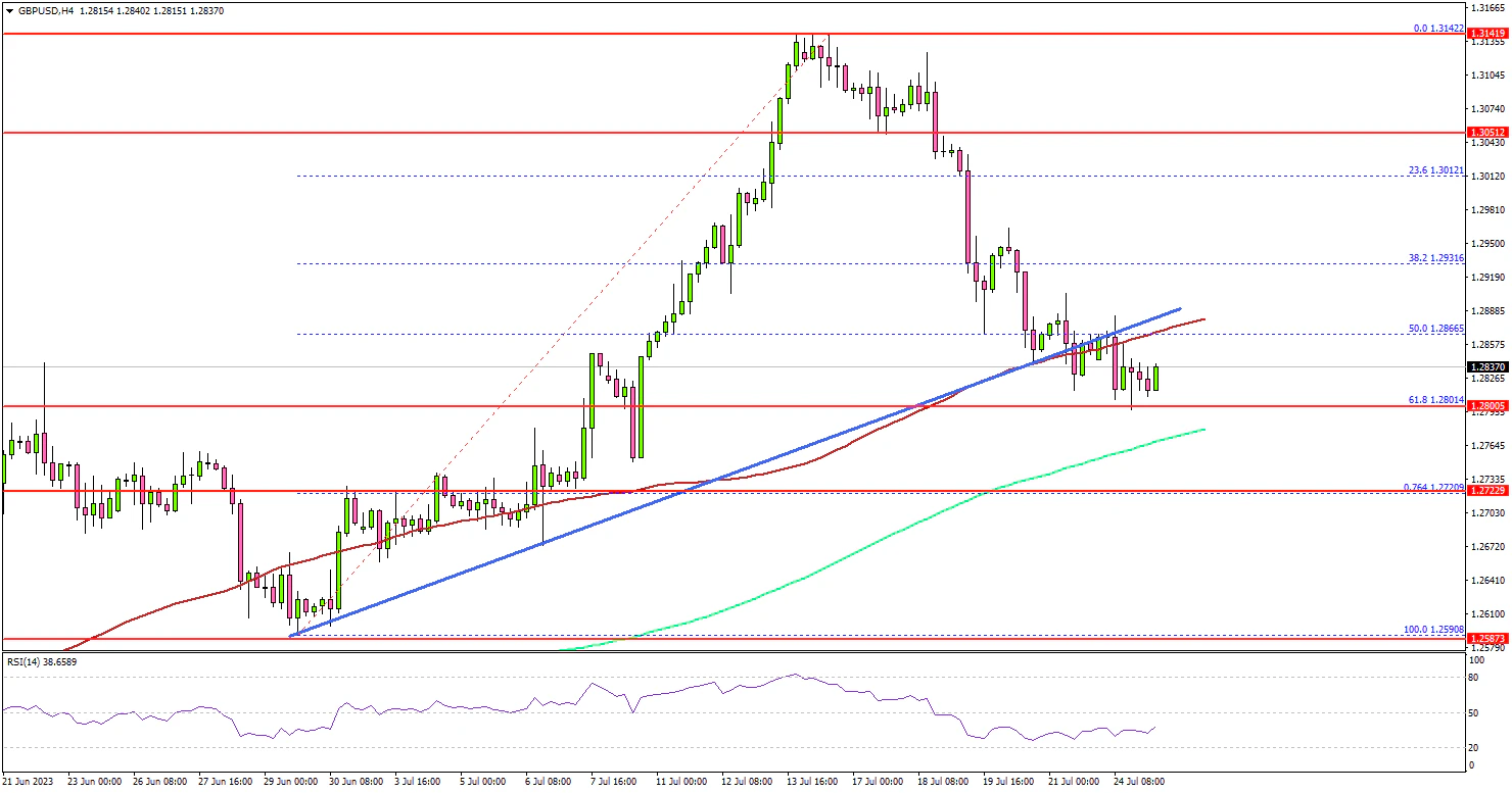 • It traded below a major bullish trend line with support near 1.2850 on the 4-hour chart.
