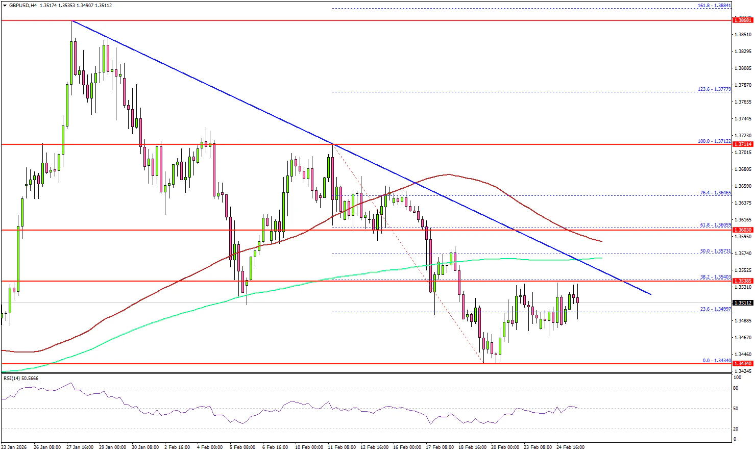 - A key bearish trend line is forming with resistance at 1.3550 on the 4-hour chart.