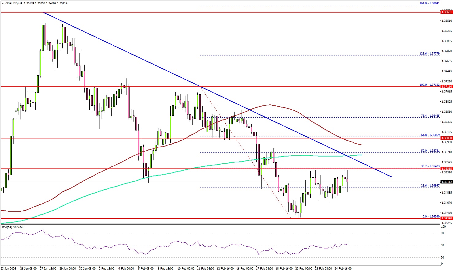 Looking at the 4-hour chart, the pair settled below 1.3550, the 100 simple moving average (red, 4-hour), and the 200 simple moving average (green, 4-hour) before the bulls appeared near 1.3430. A low was formed at 1.3434, and the pair started a recovery wave.