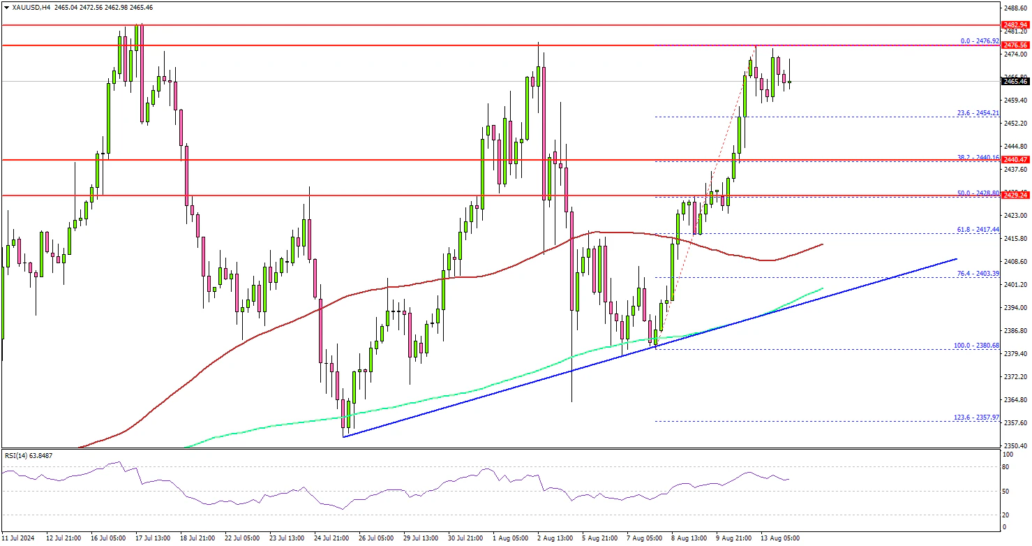 The 4-hour chart of XAU/USD indicates that the price settled above the $2,440 level, the 100 Simple Moving Average (red, 4 hours), and the 200 Simple Moving Average (green, 4 hours). It even surpassed the $2,465 resistance zone.