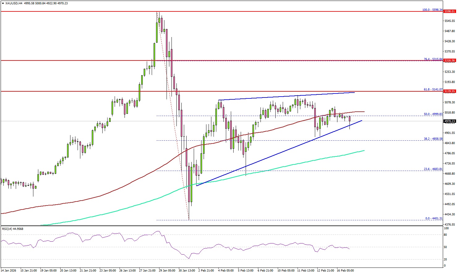 The 4-hour chart of XAU/USD indicates that the price climbed above the 50% Fib retracement level of the downward move from the $5,598 swing high to the $4,401 low. The price even surpassed the 100 Simple Moving Average (red, 4 hours) and remained well above the 200 Simple Moving Average (green, 4 hours).