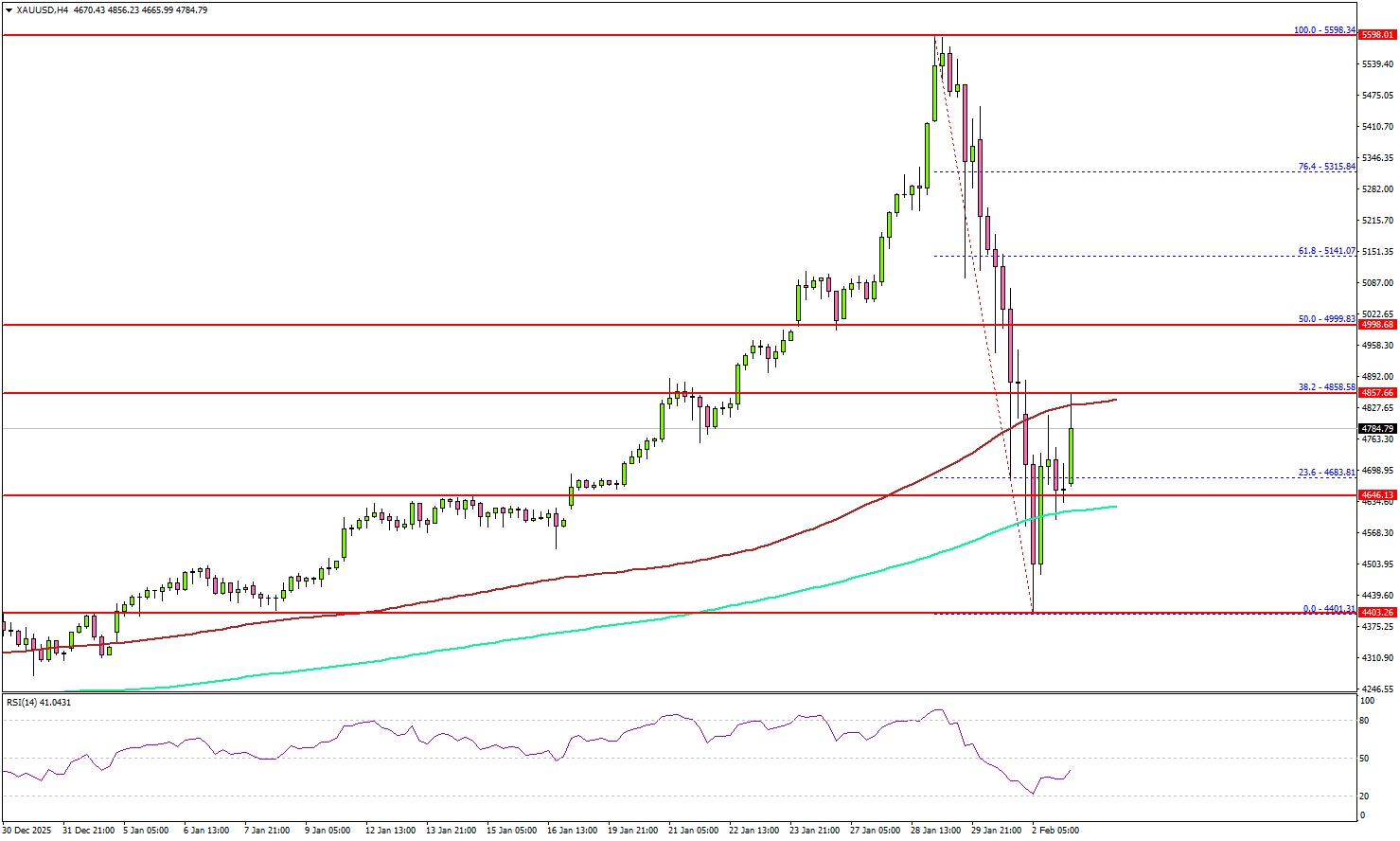 The 4-hour chart of XAU/USD indicates that the price traded as low as $4,401 and recently started a recovery wave above the 200 Simple Moving Average (green, 4 hours). The price climbed above the 23.6% Fib retracement level of the downward move from the $5,598 swing high to the $4,401 low.
