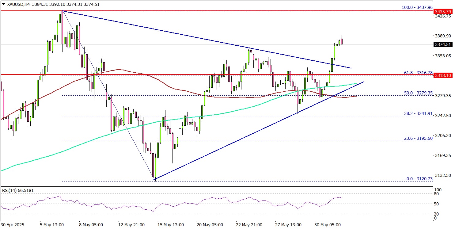 The 4-hour chart of XAU/USD indicates that the price cleared a key contracting triangle with resistance at $3,335. There was a clear move above the 61.8% Fib retracement level of the downward move from the $3,438 swing high to the $3,120 low.