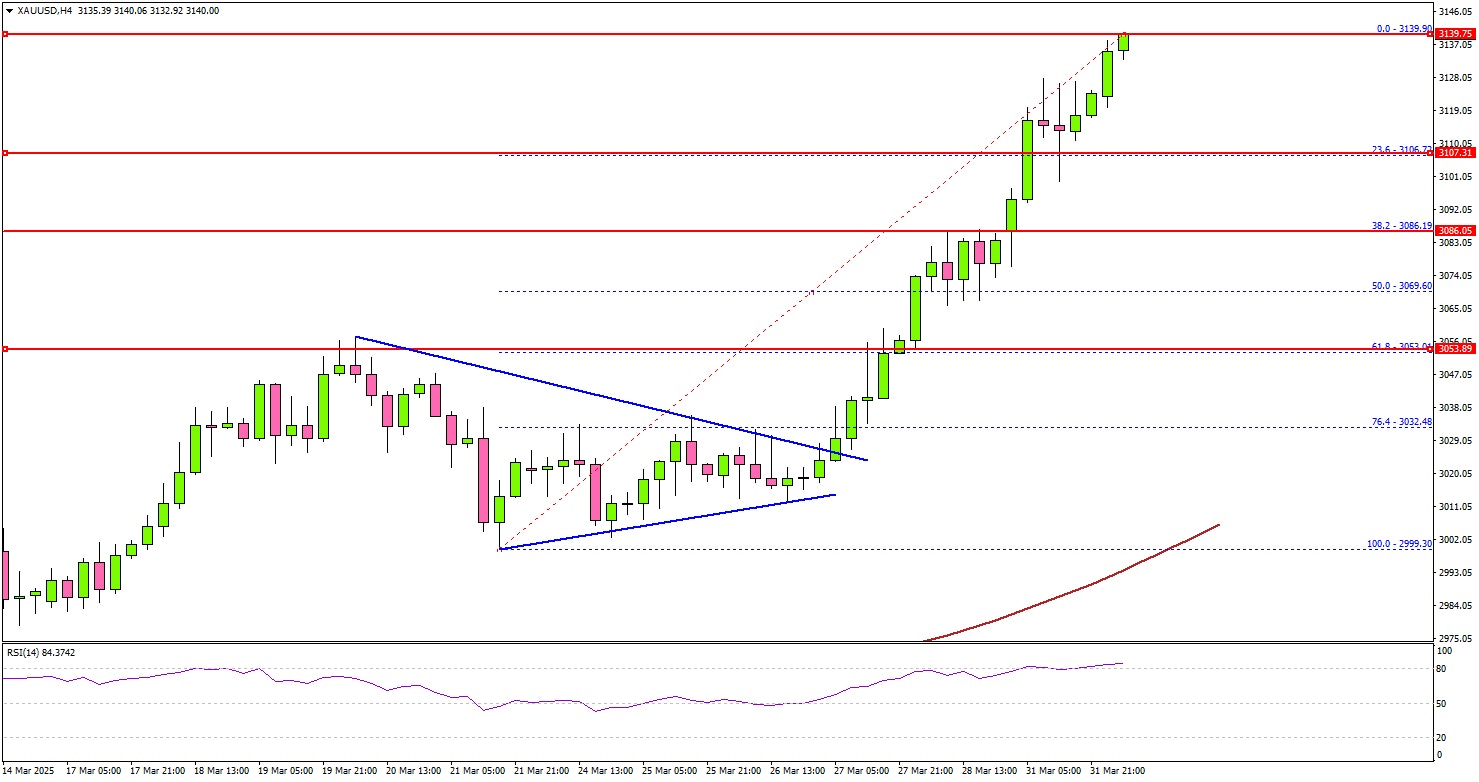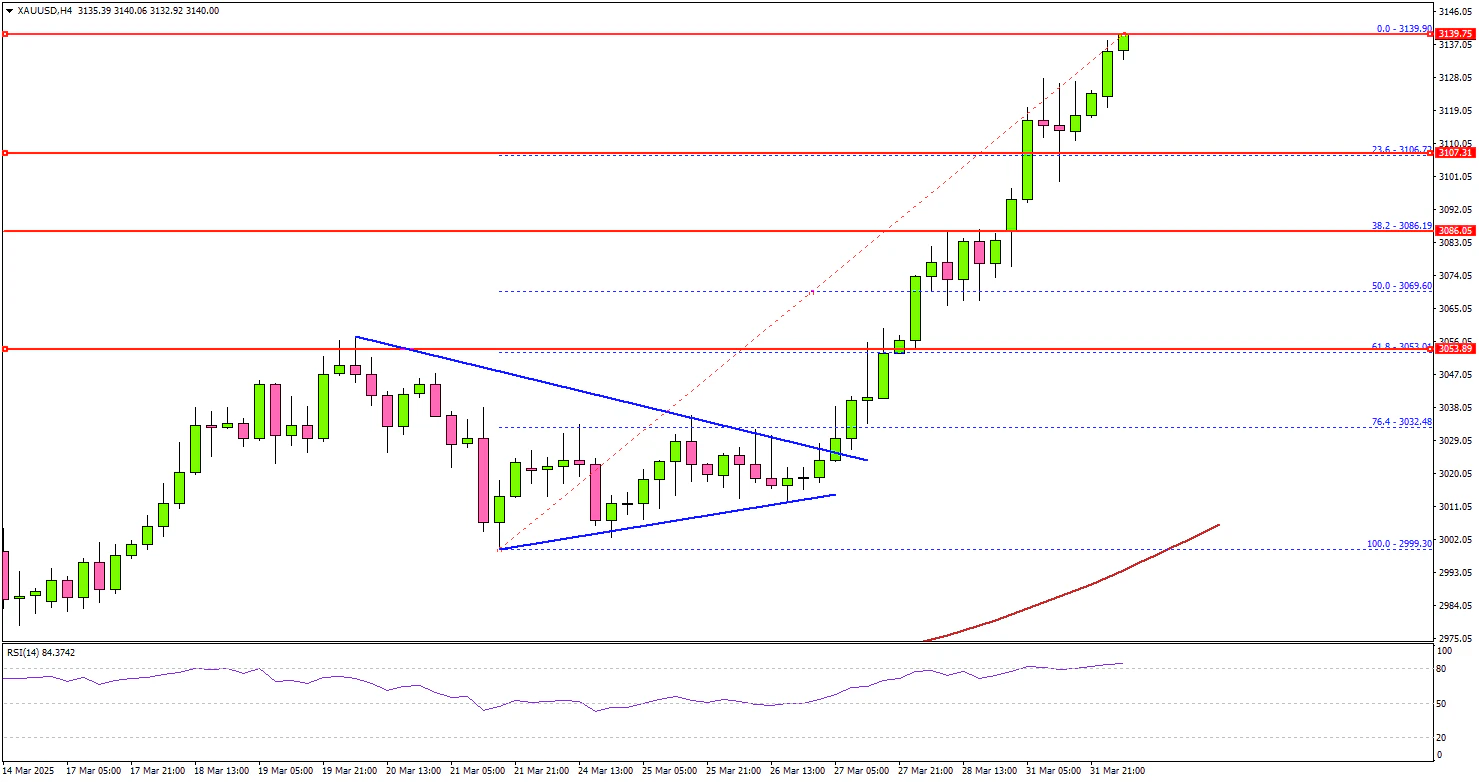 Gold prices started a fresh rally above the $3,000 resistance. The bulls pumped the price above the $3,100 level and the price traded to a new record high.