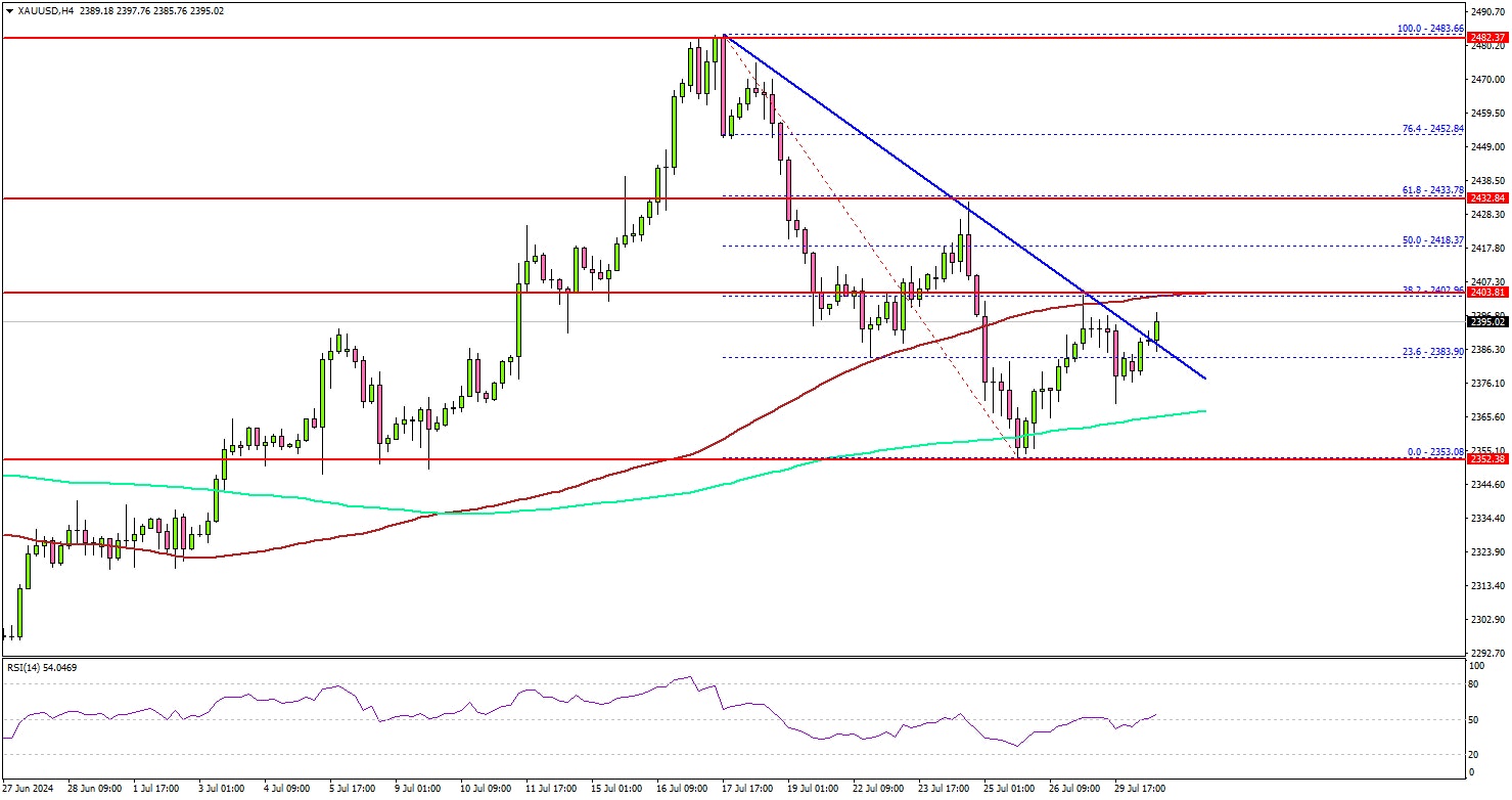The price surpassed the 23.6% Fib retracement level of the downward move from the $2,483 swing high to the $2,353 low. The price is now facing resistance near the $2,400 zone and the 100 Simple Moving Average (red, 4 hours).