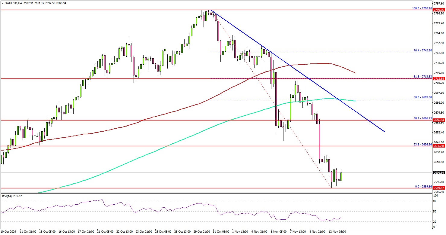 The decline even gained pace below $2,620. Finally, the price tested the $2,590 zone before it started a consolidation phase. On the downside, initial support is near the $2,590. The first major support is near the $2,580 level.