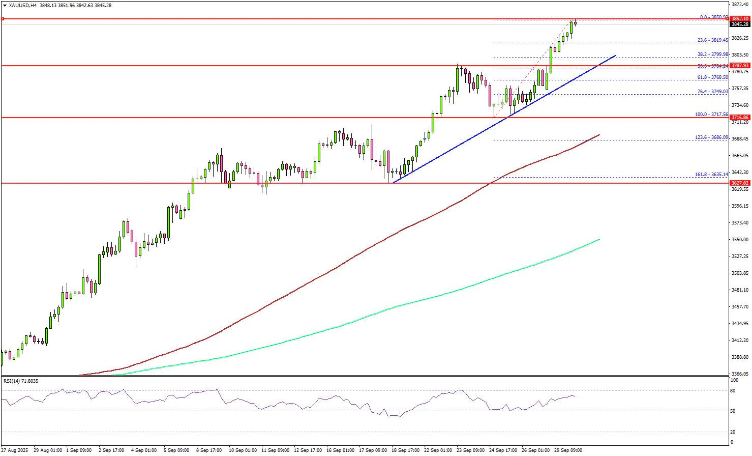 Gold traded to a new record high near $3,851 and might continue to rise. On the upside, immediate resistance is near the $3,855 level. The next major resistance sits near the $3,865 level.