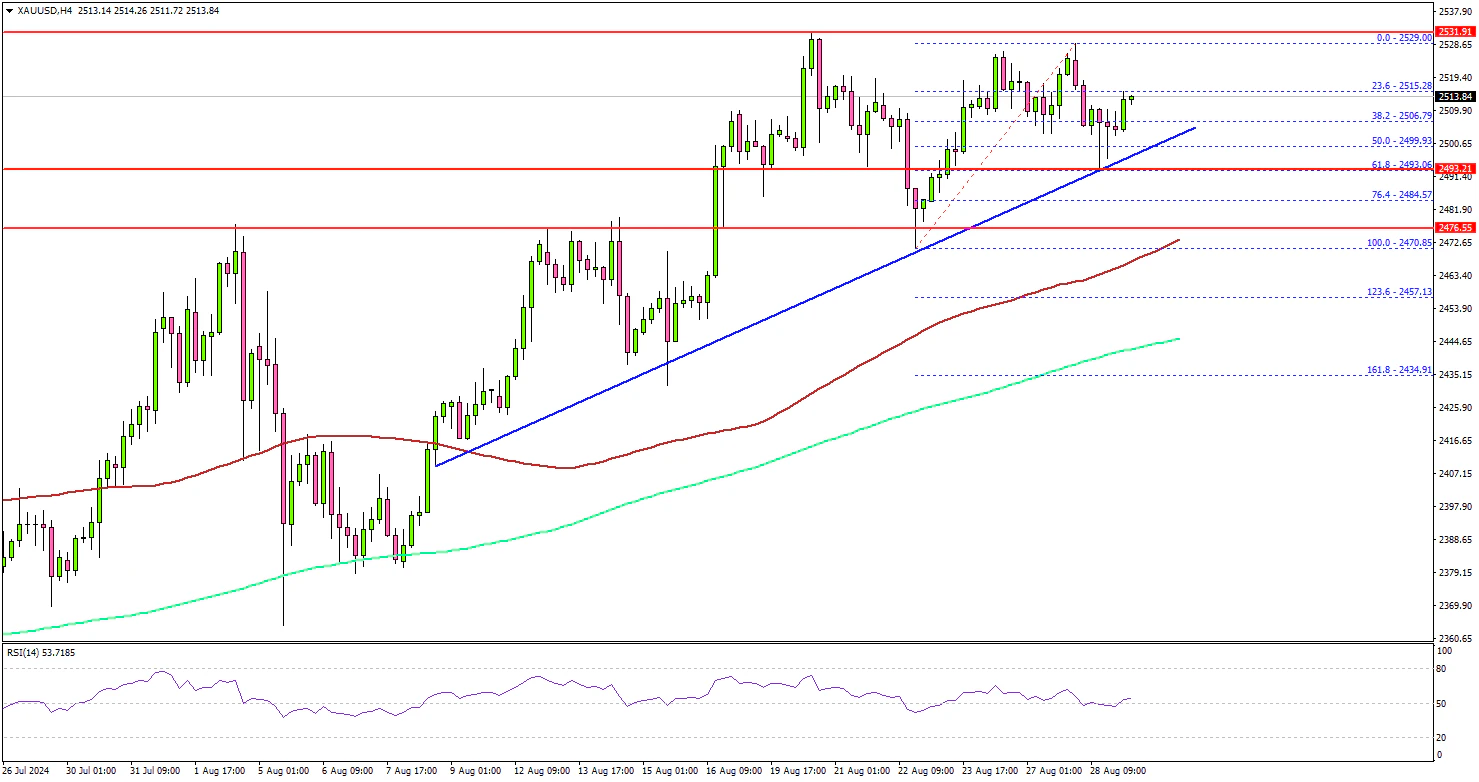 Any more losses might send gold prices toward $2,400. On the upside, immediate resistance is near the $2,515 level. The first major resistance sits near the $2,530 level.