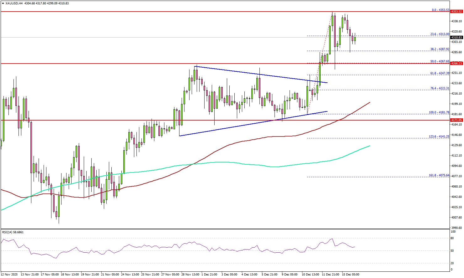 The 4-hour chart of XAU/USD indicates that the price cleared a key contracting triangle with resistance at $4,230 to enter a positive zone. The bulls even pumped the price above $4,320. The price tested $4,350 before there was a consolidation phase.