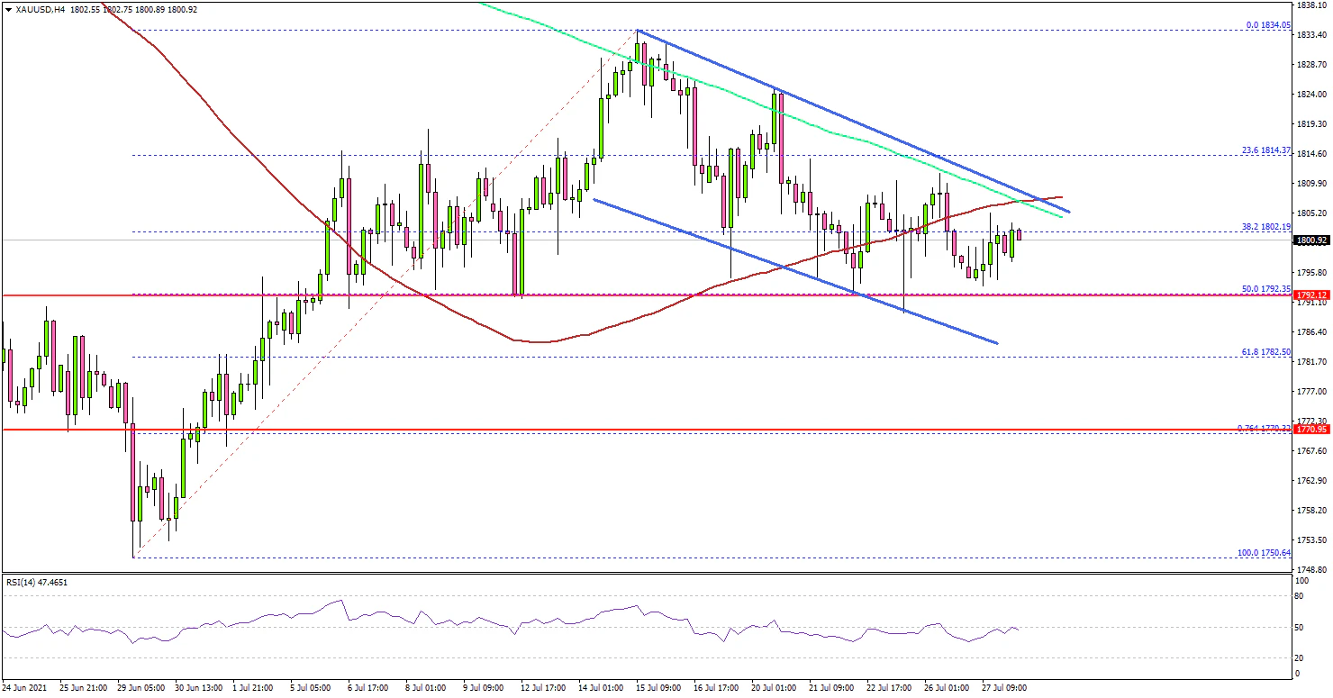If there is an upside break above $1,810 and $1,820, the price is likely to test $1,834. The next key resistance is near the $1,850 level. If not, the price could start a fresh decline below the $1,790 support level. The next major support is near the $1,775 level.
