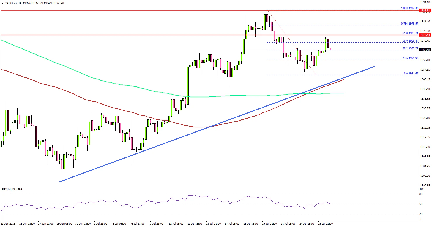 Gold price found support near $1,950 against the US Dollar. The price seems to be forming a base above $1,950 and slowly moving higher.