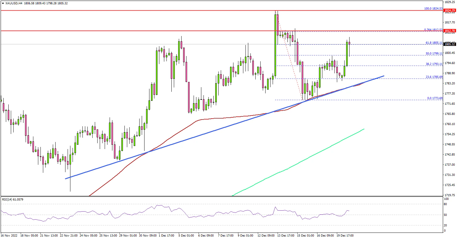 The 4-hours chart of XAU/USD indicates that the price gained pace above the $1,785 resistance zone. The price even moved above the $1,800 level and settled well above the 100 simple moving average (red, 4-hours) plus the 200 simple moving average (green, 4-hours).