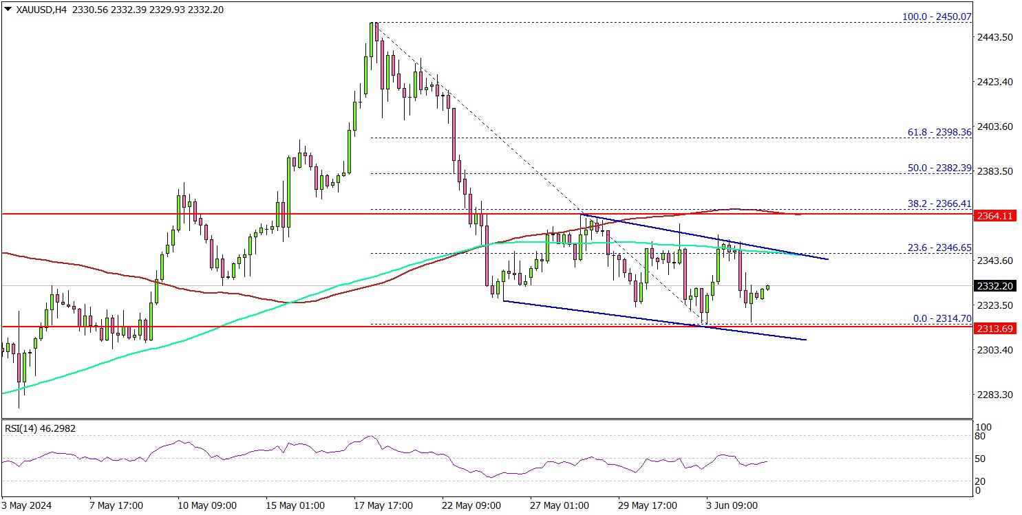 - A key declining channel is forming with resistance at $2,345 on the 4-hour chart.