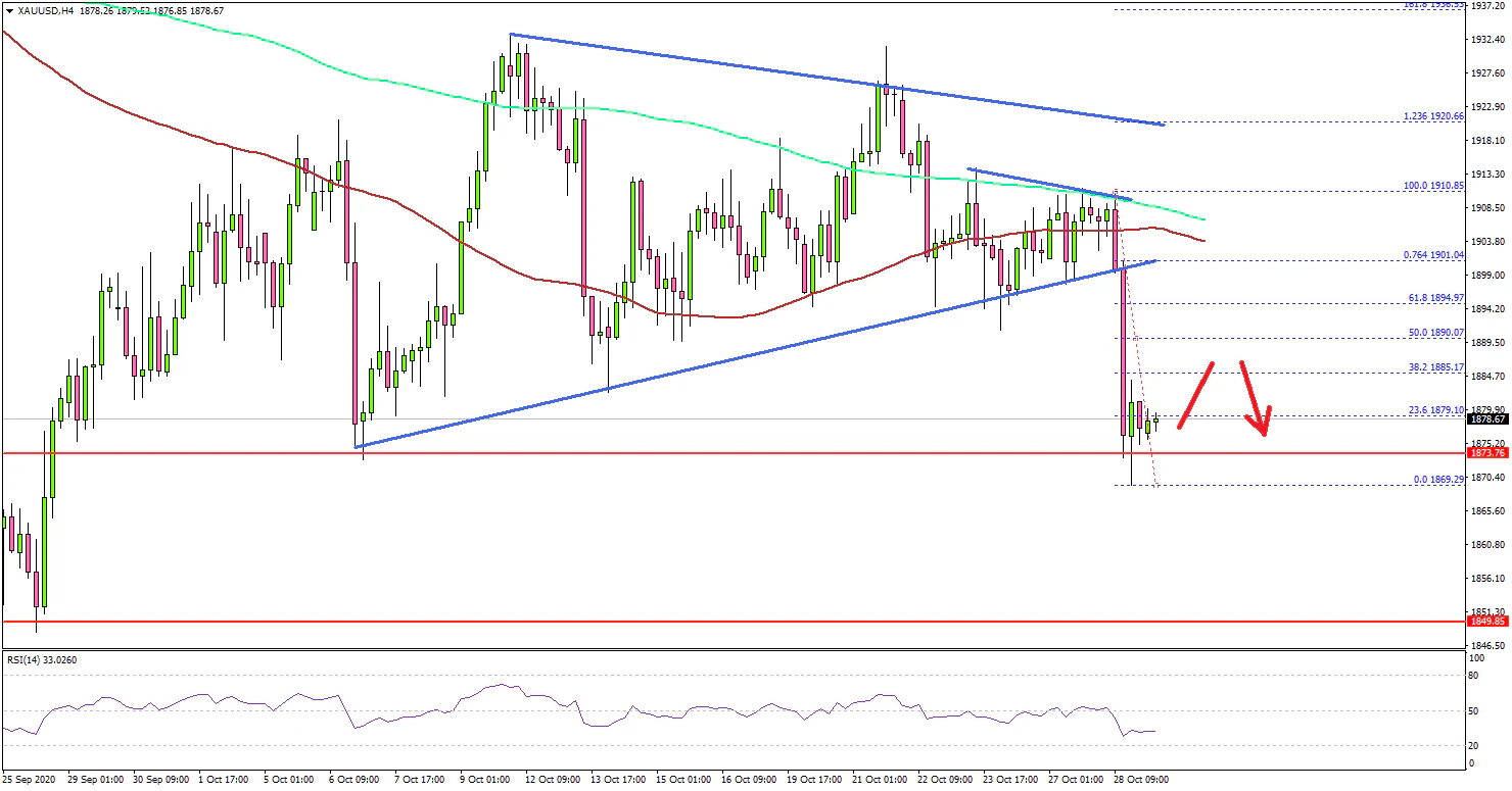 The 4-hours chart of XAU/USD indicates that the price started a fresh decline from the $1,910 swing high and the 200 simple moving average (green, 4-hours).