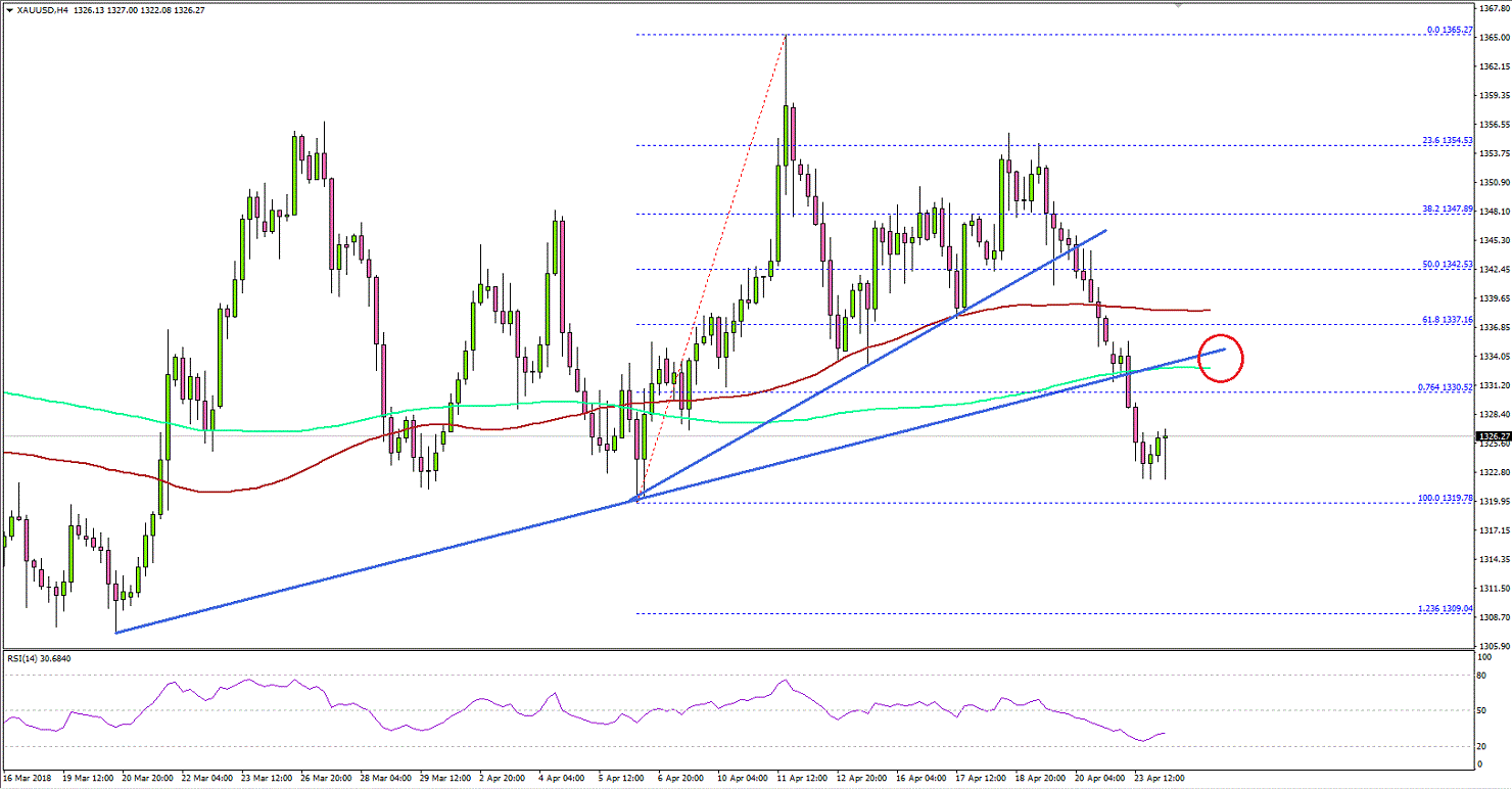 There was a major top formed above the $1,355 level in gold price against the US Dollar. The price declined sharply and broke many important supports near $1,335 to move into a bearish zone.Gold Price Technical AnalysisLooking at the 4-hours chart, there were back to back bearish candles from the $1,354 swing high. The price declined and broke the 50% Fib retracement level of the last wave from the $1,319 low to $1,365 high.More importantly, there was a break below two bullish trend lines at $1,345 and $1,335 on the 4-hours chart of XAU/USD. It also declined below $1,330, and the 200 simple moving average (green, 4-hour) and the 100 simple moving average (red, 4-hour).These are negative signs, which could ignite more declines in Gold price in the near term. The next stop for sellers could be near the 1.236 Fib extension of the last wave from the $1,319 low to $1,365 high.On the upside, the broken support near $1,335 and the 200 simple moving average (green, 4-hour) will most likely act as resistances if the price corrects higher.Recently, the US Existing Home Sales report for March 2018 was released by the National Association of Realtors. The market was looking for a 0.2% rise in sales compared with the previous month.The actual result was better as there was a rise of 1.1% in sales to a seasonally adjusted annual rate of 5.60 million. However, the current reading was less than the last +3.0%.Overall, gold price has moved into a bearish zone and it may perhaps decline further towards the $1,310 level.