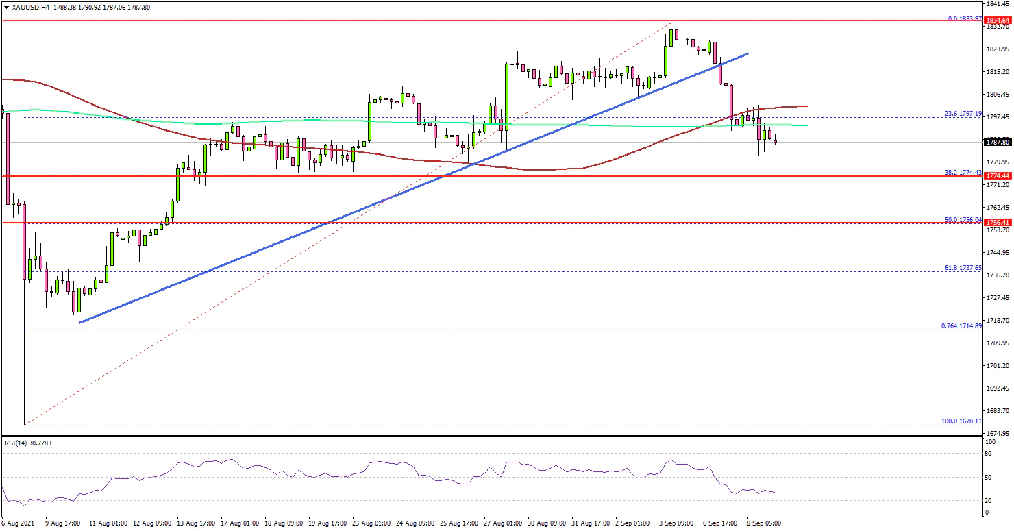 There was also a break below the 23.6% Fib retracement level of the upward move from the $1,678 swing low to $1,833 high. An immediate support is near the $1,775 level.