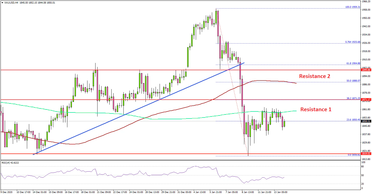 The 4-hours chart of XAU/USD indicates that the price declined below a major bullish trend line at $1,905 to start the recent drop. The price even broke the $1,850 support level and settled well below the 100 simple moving average (red, 4-hours).