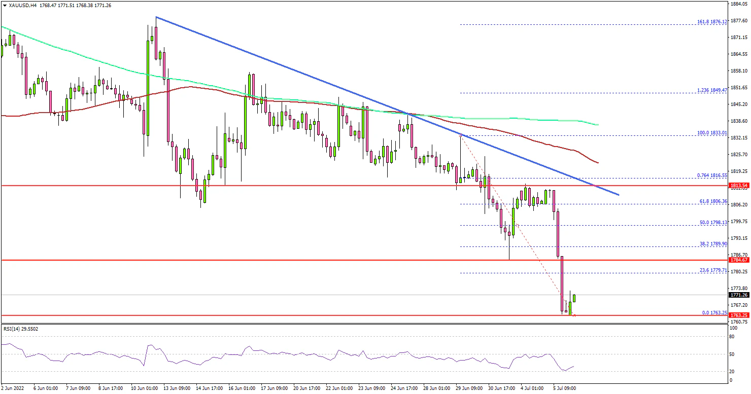 The next major resistance is near the $1,825 level the 100 simple moving average (red, 4-hours). To start a decent recovery wave, the price must clear the trend line resistance and then settle above the $1,825 zone.