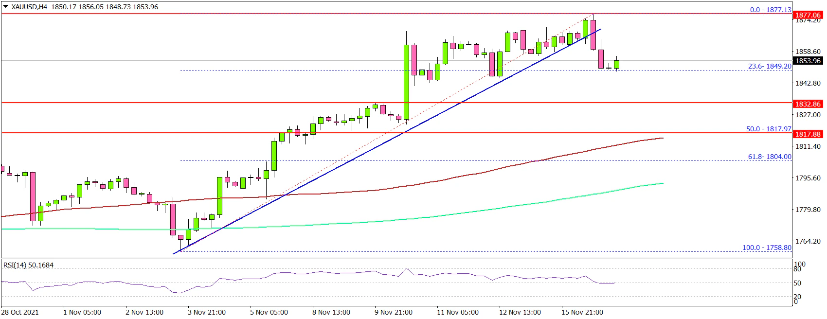 The price traded as high as $1,877 and is currently correcting gains. An immediate support is near the $1,850 level. It is near the 23.6% Fib retracement level of the upward move from the $1,758 swing low to $1,877 high.