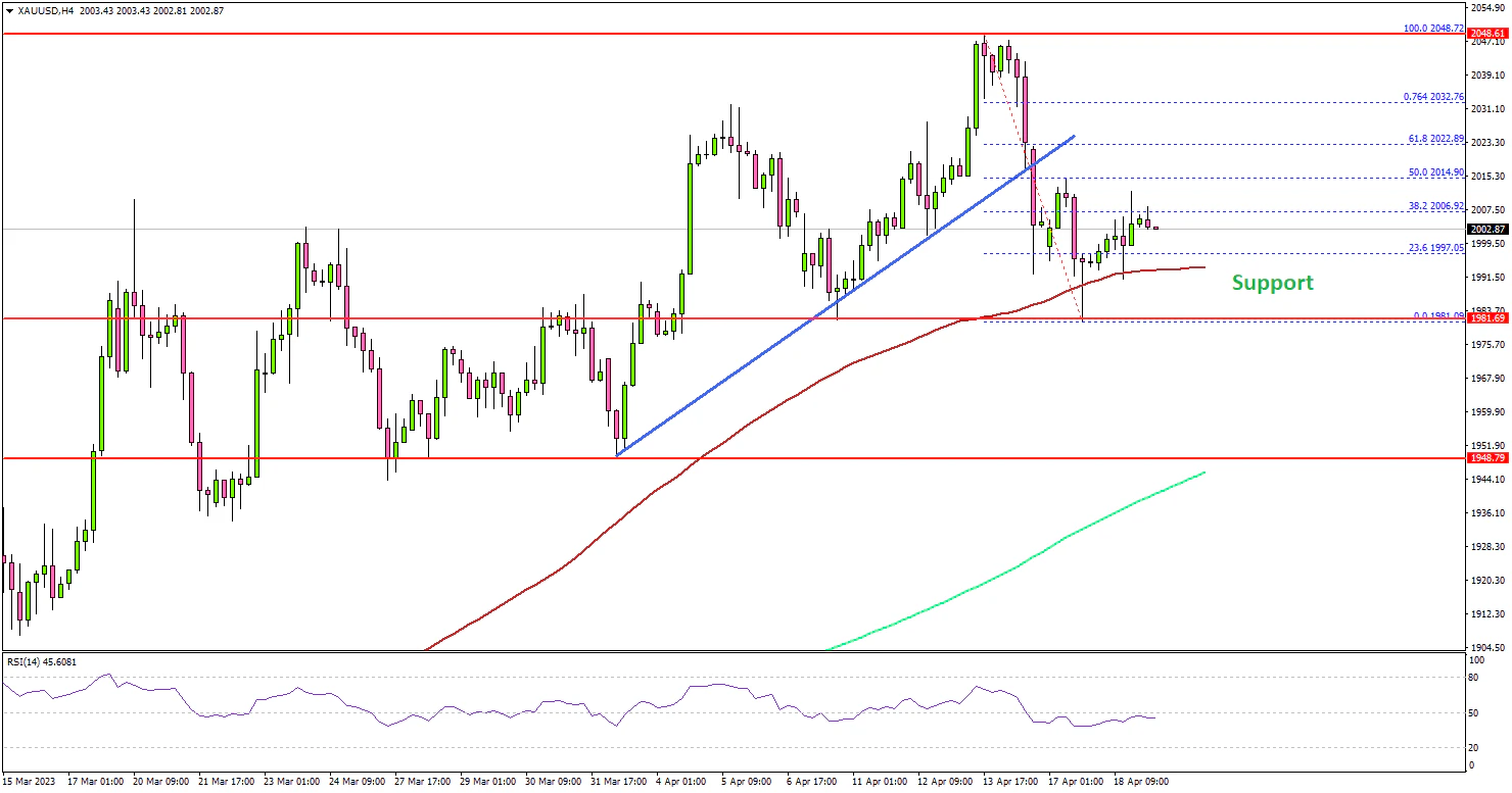 The 4-hour chart of XAU/USD indicates that the price declined below the $2,020 support. It also traded below a major bullish trend line with support at $2,020. The decline was such that the price spiked below the $2,000 level and tested the 100 Simple Moving Average (red, 4 hours).