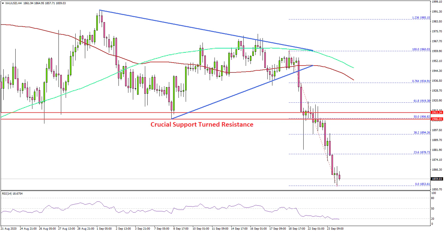 After struggling to clear the $1,960 resistance zone, gold price started a fresh decline against the US Dollar. The price broke many key supports near the $1,920 and $1,910 levels.