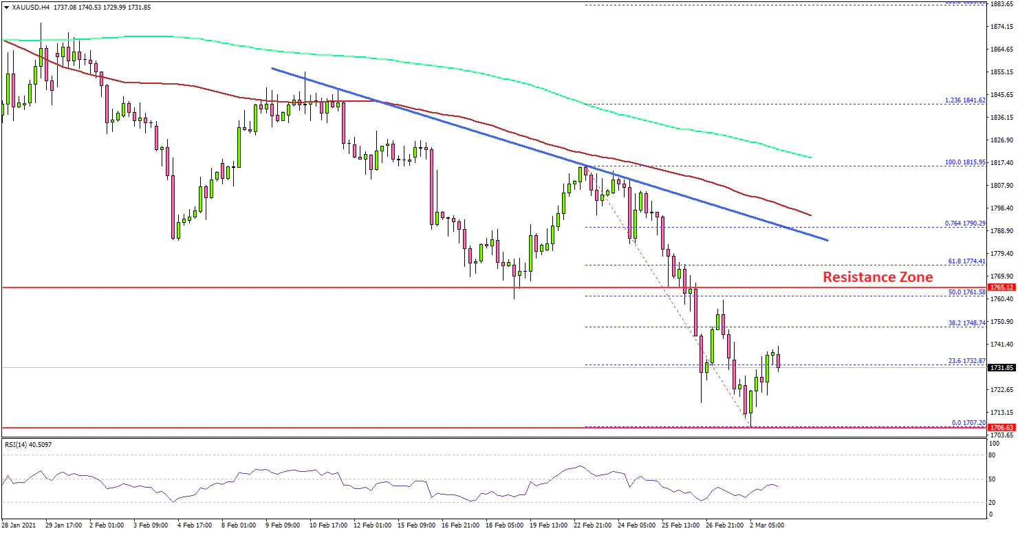 There was also a break below the $1,730 support and the price traded close to $1,700. A low is formed near $1,707 and the price is struggling to recover higher. An initial resistance is near the $1,745 level.