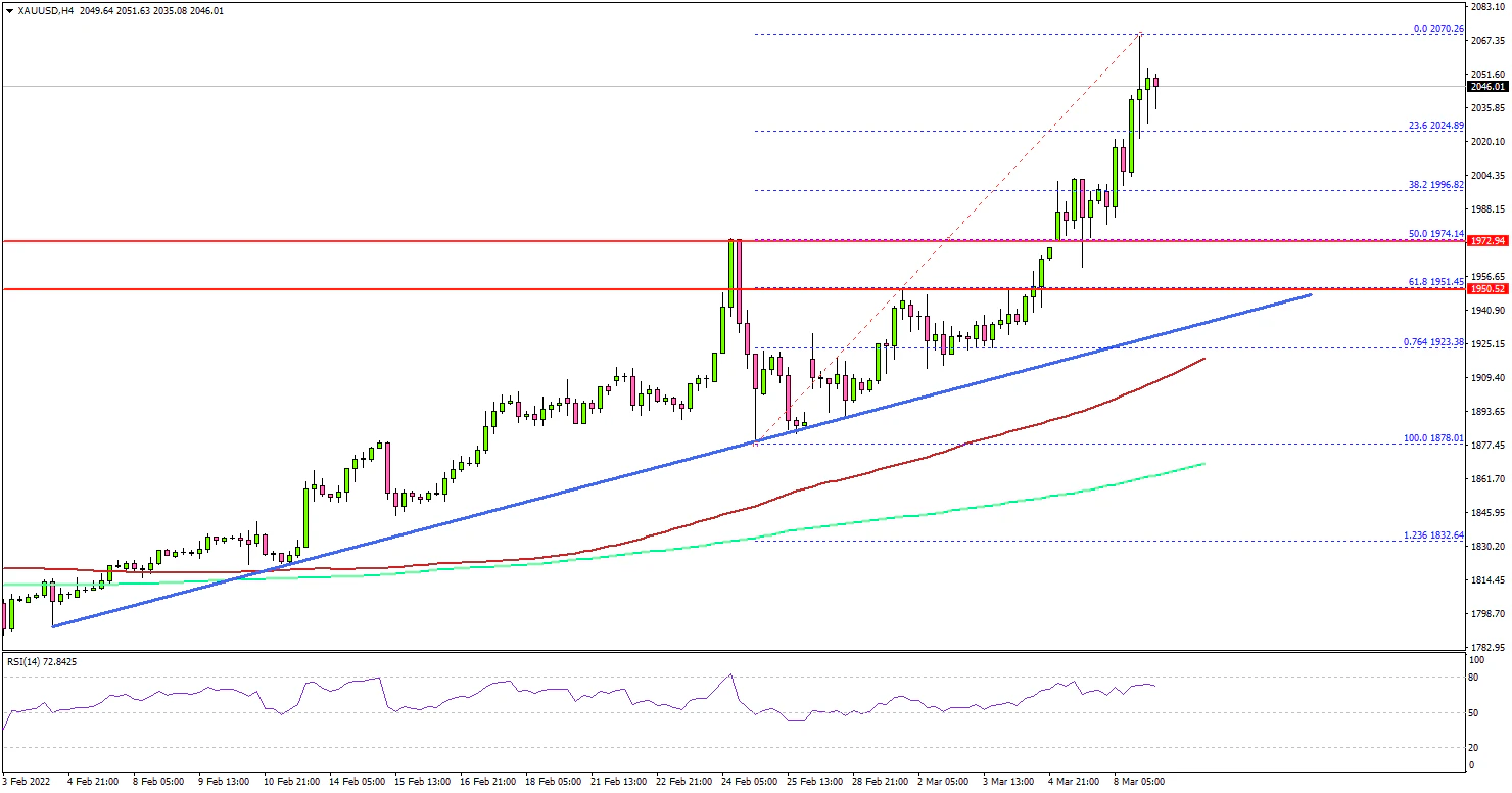 The 4-hours chart of XAU/USD indicates that the price gained pace for a move above the main $2,000 resistance. The price traded to a new multi-month high above $2,070.
