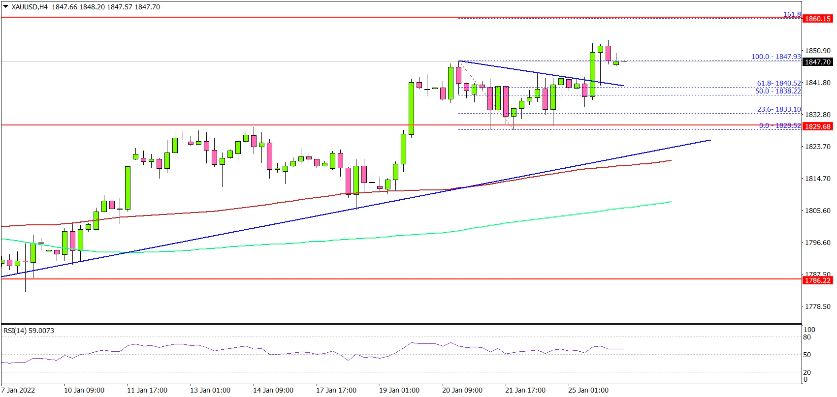 The 4-hours chart of XAU/USD indicates that the price jumped above the $1,840 level. The price settled well above the 100 simple moving average (red, 4-hours) and the 200 simple moving average (green, 4-hours).