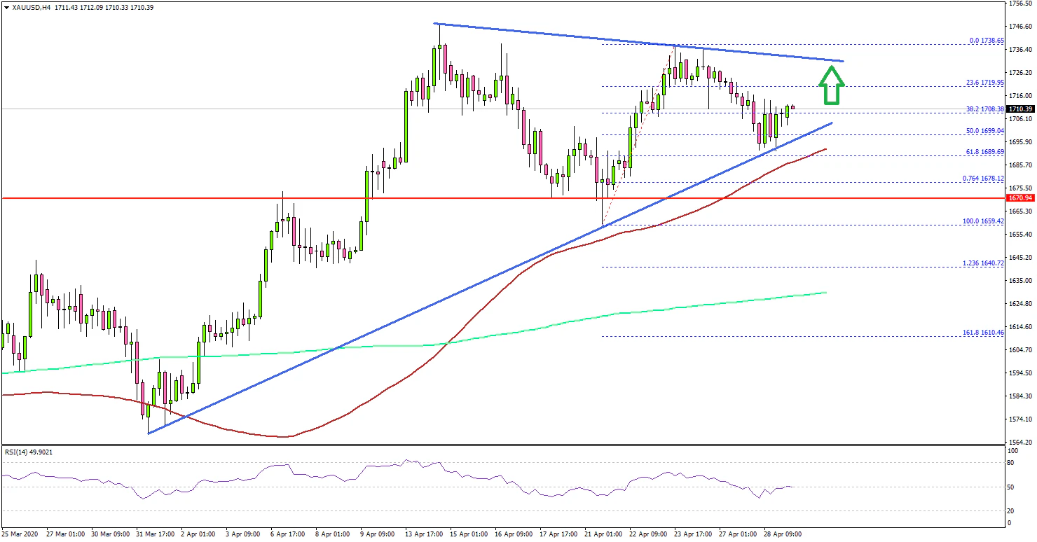 Any further losses may perhaps push gold price towards the $1,680 support. The next key uptrend support is near the $1,630 level or the 200 simple moving average (4-hours, green).