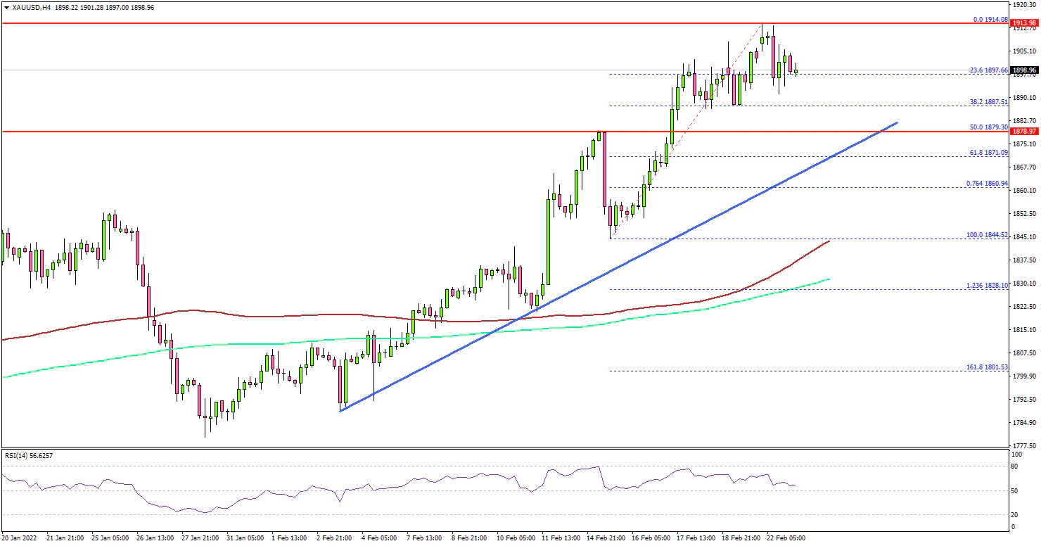 It even climbed above the $1,900 level. A high is formed near $1,915 and the price is now consolidating gains. On the upside, the bulls are facing a major hurdle near $1,915 and $1,920. A close above $1,920 might set the pace for a move to $1,950.