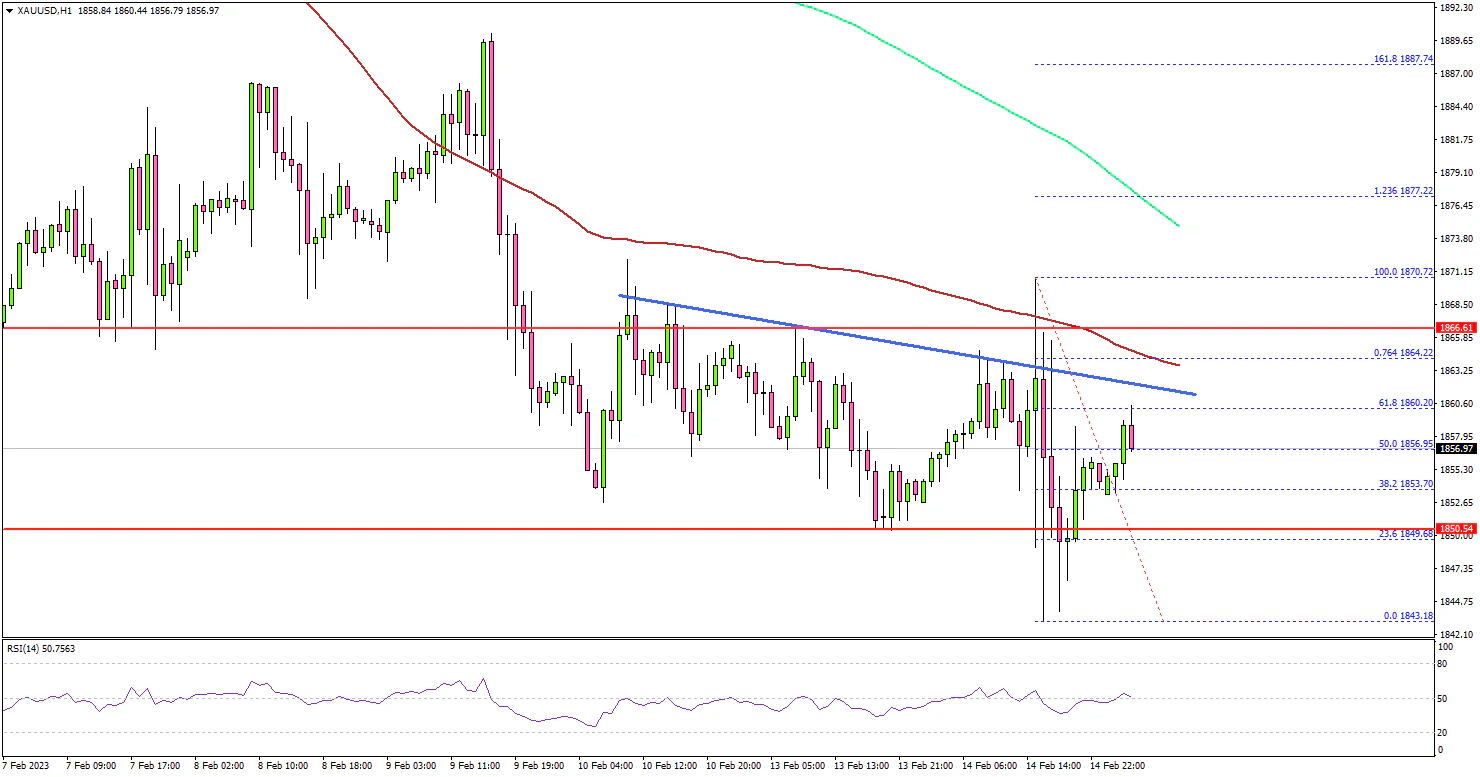 There was a strong decline below the $1,865 and $1,860 support levels. The price even spiked below the $1,850 level. However, the bulls were active near the $1,842 zone.