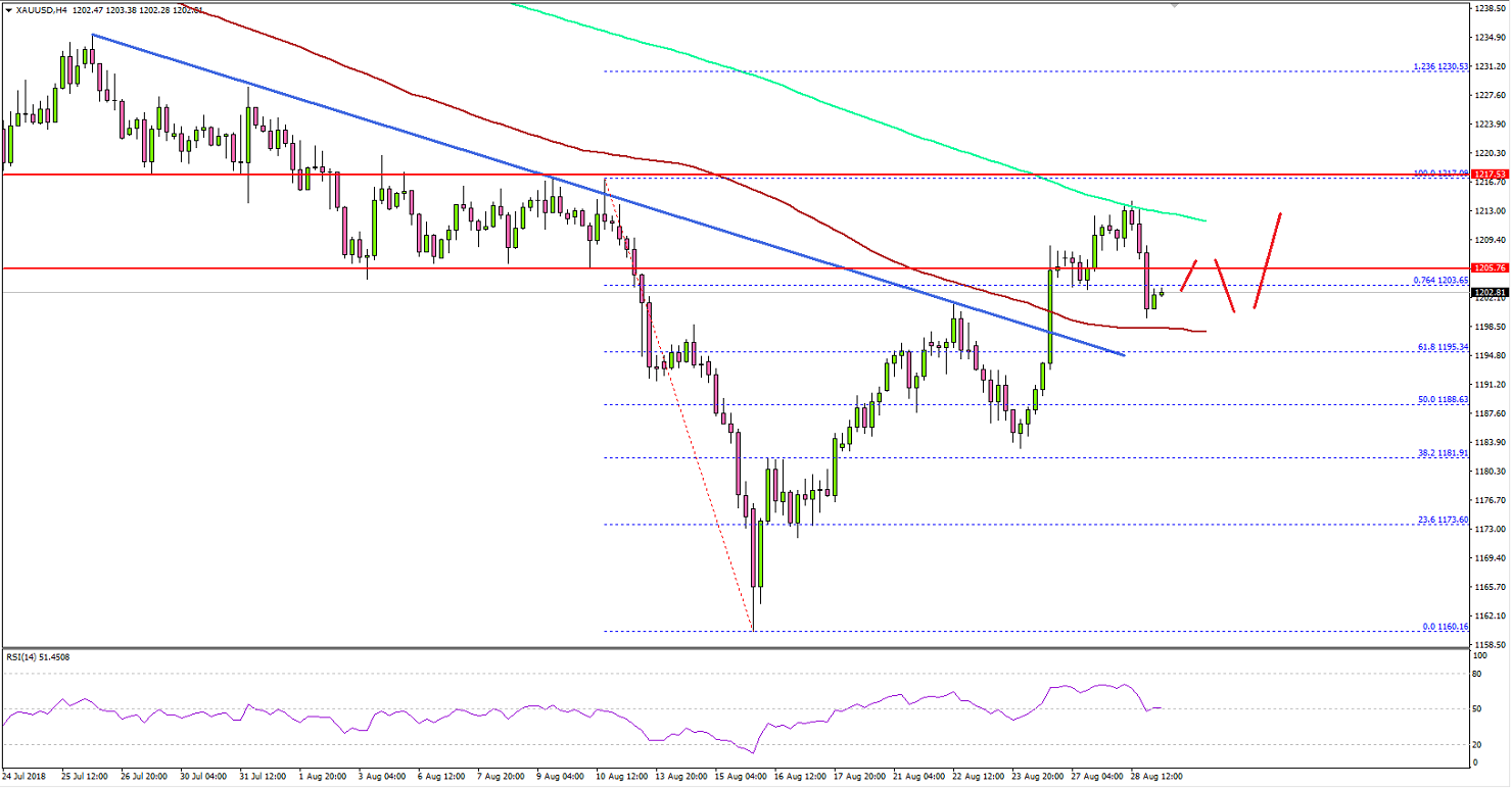 The 4-hour chart of XAU/USD indicates that the price formed an intermediate low at $1,182 and surged higher. During the upside move, it broke the $1,200 and $1,205 resistance levels. More importantly, there was a break above a major bearish trend line with resistance near $1,198.The price settled above the $1,200 level and the 100 simple moving average (red, 4-hours). Additionally, there was a clear break of the 76.4% Fib retracement level of the last decline from the $1,217 high to $1,160 low.The price is now trading nicely in a bullish zone and it could continue to move higher towards the $1,220 resistance. Above $1,220, the price may possibly test the 1.236 Fib extension level of the last decline from the $1,217 high to $1,160 low at $1,230.On the flip side, if the price corrects lower, the broken resistance near $1,200 and the 100 SMA are likely to act as strong supports in the near term.Recently, the US Wholesale Inventories report for July 2018 (Preliminary) was released by the US Census Bureau. The market was looking for a rise of 0.1% in the Wholesale Inventories, similar to the last 0.1% increase.The result was negative as there was a sharp rise in the Wholesale Inventories by 0.7%. Additionally, the international trade deficit increased $4.3 billion to $72.2 billion. The report added that:Exports of goods for July were $140.0 billion, $2.5 billion less than June exports. Imports of goods for July were $212.2 billion, $1.8 billion more than June imports.Overall, there was a slight increase in selling pressure on the US Dollar. Major pairs like EUR/USD and GBP/USD also gained bullish momentum recently and traded above 1.1680 and 1.2850 respectively. However, today’s GDP release in the US could impact the market sentiment since the forecast is slated for a solid 4.0% growth in Q2 2018.
