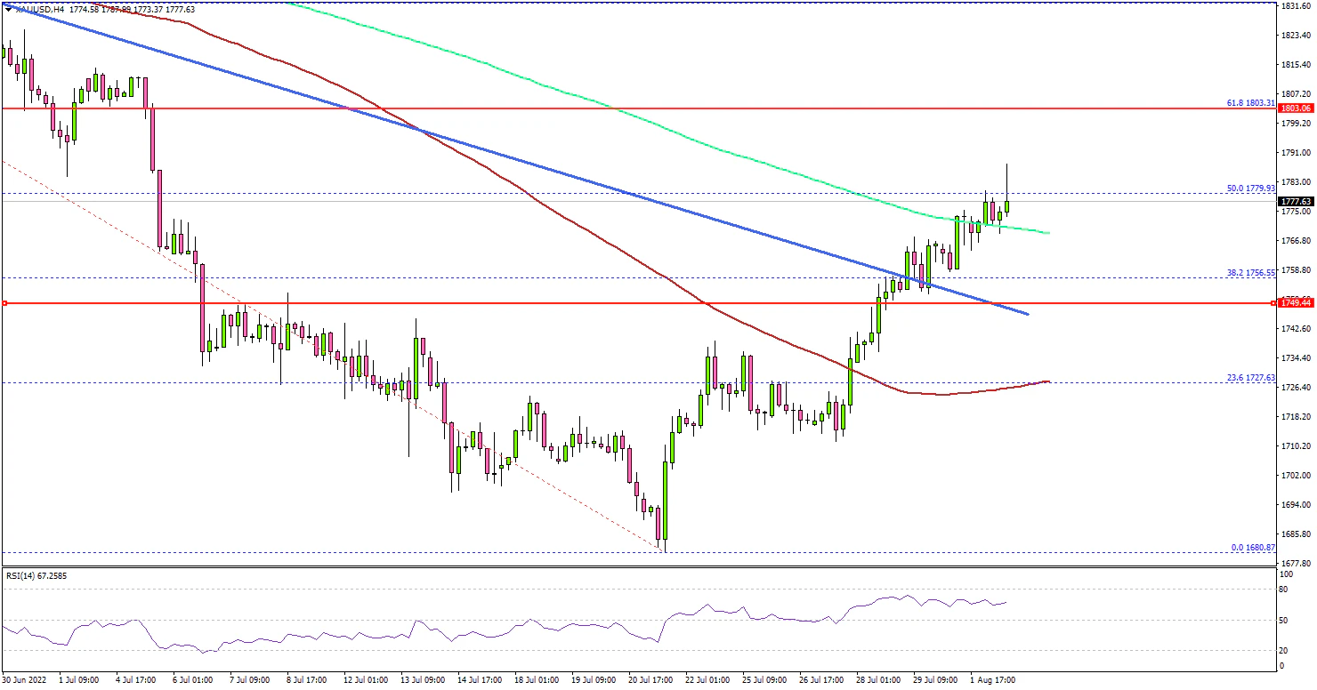 Any more gains might send the price towards the $1,825 level. On the downside, an initial support is near the $1,765 level and the 100 simple moving average (red, 4-hours).