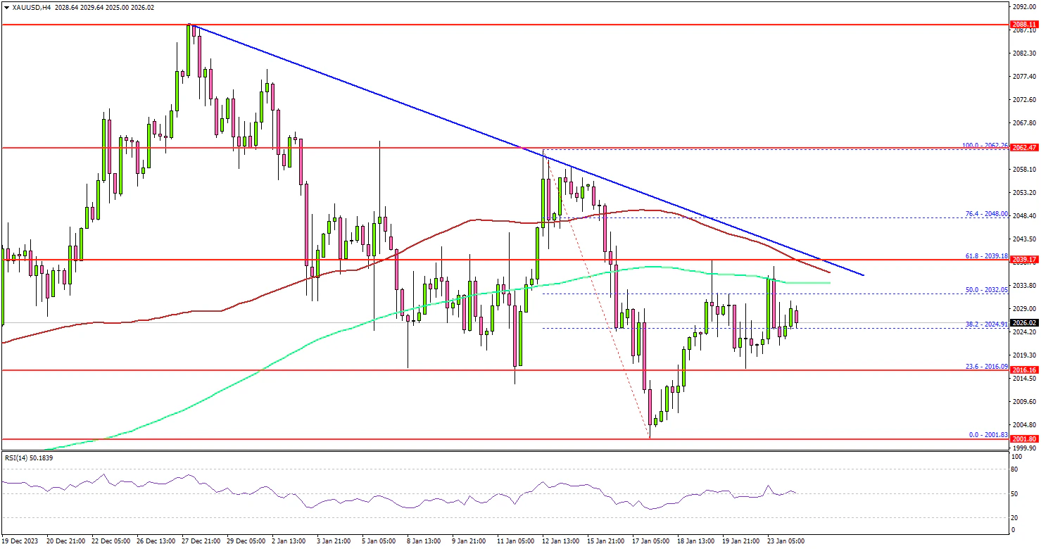 Gold found support near the $2,000 zone against the US Dollar. It started a recovery wave above the $2,020 zone but now faces a lot of hurdles.