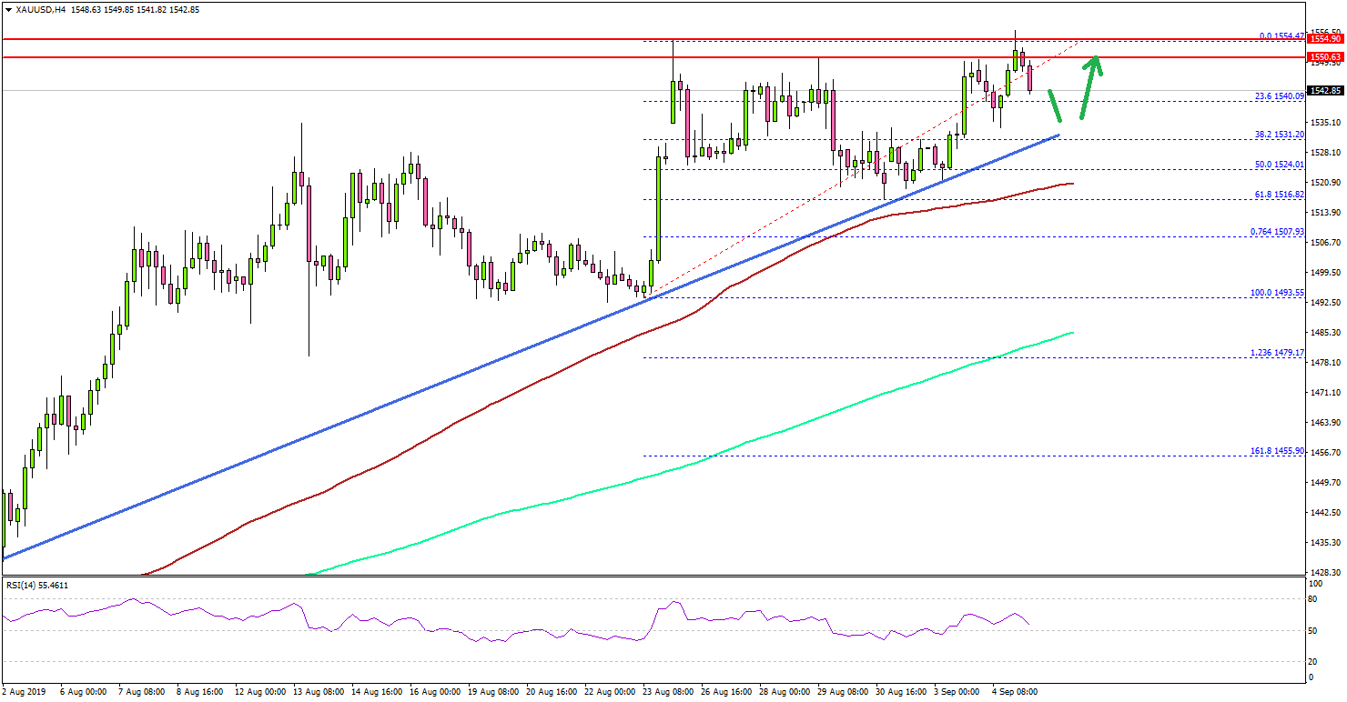 • Gold price seems to be facing resistance near$1,550 and $1,555 against the US Dollar.