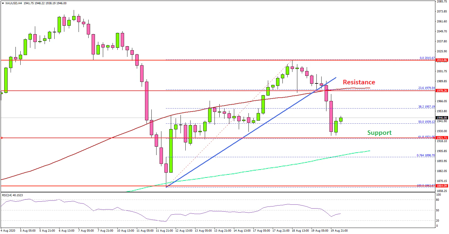 After declining sharply to $1,863, gold price started an upside correction against the US Dollar. The price recovered nicely above $1,900 and $1,950, but it struggled to gain strength above the $2,000 level.