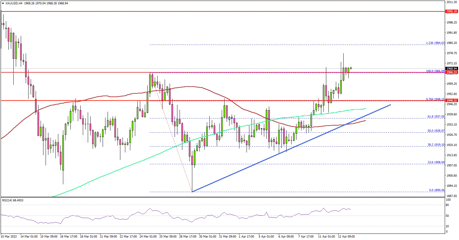 The price climbed above the 76.4% Fib retracement level of the main decline from the $1,966 swing high to $1,890 low. It even broke the $1,966 swing high.