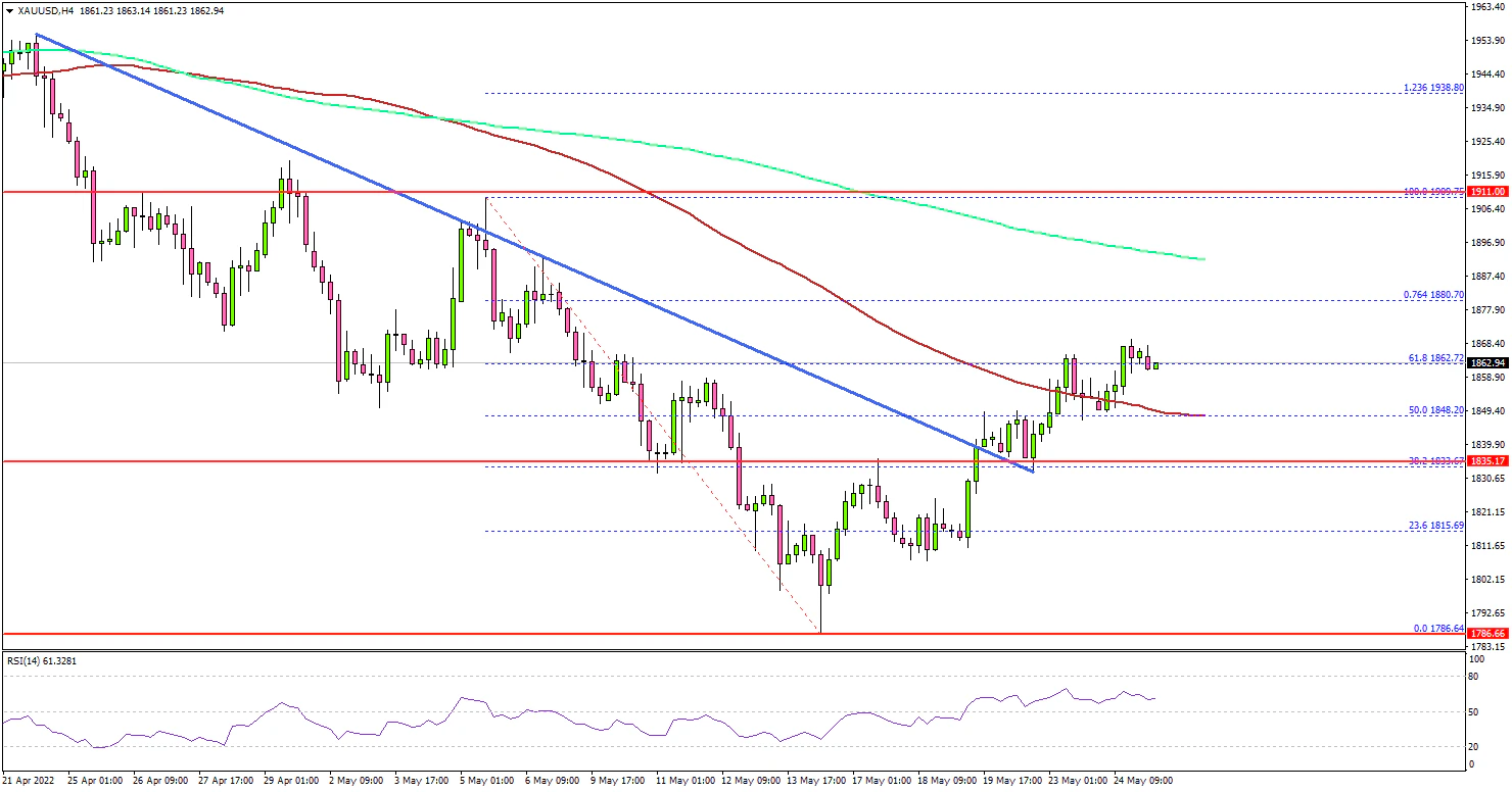 The price cleared the 50% Fib retracement level of the downward move from the $1,909 swing high to $1,786 low. Finally, it climbed above the $1,850 resistance and the 100 simple moving average (red, 4-hours).