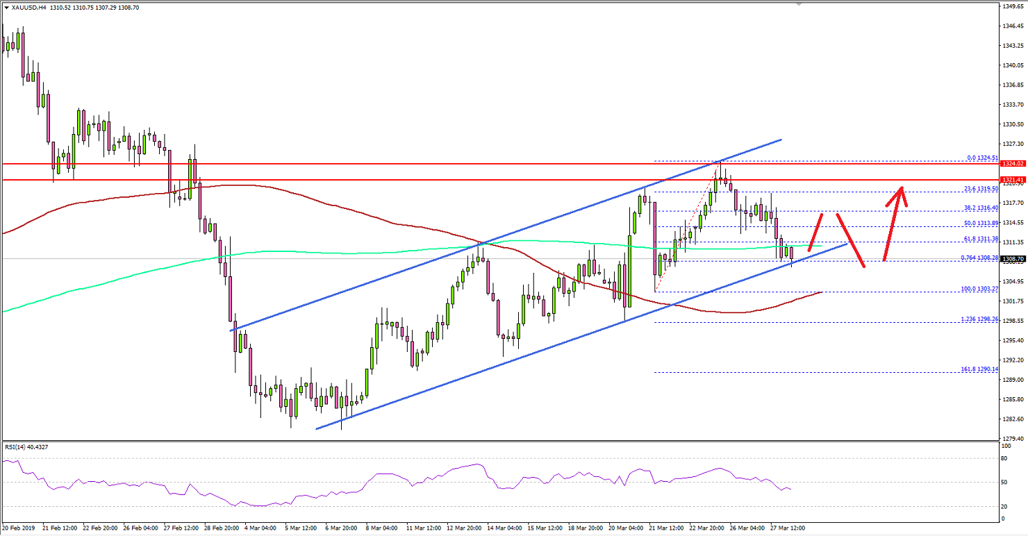 The 4-hour chart of XAU/USD indicates that the price settled above the $1,300 pivot level, plus the 100 simple moving average (red, 4-hours) and the 200 simple moving average (green, 4-hours).There were multiple swing highs and lows, but the price followed a bullish path and traded above the $1,320 resistance. However, the price faced a strong hurdle near the $1,325 level, which was a support earlier.A high was formed near $1,324 and later the price corrected below the 50% Fib retracement level of the last wave from the $1,303 low $1,324 high.However, there are many supports on the downside near the $1,305 level and the 200 simple moving average (green, 4-hours). Besides, there is a significant ascending channel formed with support at $1,308 on the 4-hours chart of XAU/USD.If there is a break and close below the channel support, the price could extend losses towards the $1,303 swing low and the 100 simple moving average (red, 4-hours). On the flip side, a convincing break above the $1,325 resistance will most likely set the pace for more gains towards the $1,330 and $1,334 levels.Fundamentally, the US Trade Balance report for Jan 2019 was released by the Bureau of Economic Analysis and the U.S. Census Bureau. The market was looking for a trade deficit of around $-57.0B.Though, the result was better than the forecast as there was a trade deficit of $-51.1B, improved from the last revised reading of $-59.9B. The report added that:The January decrease in the goods and services deficit reflected a decrease in the goods deficit of $8.2 billion to $73.3 billion and an increase in the services surplus of $0.5 billion to $22.1 billion.Overall, gold price remains supported for more gains as long as it stays above $1,303. Looking at major pairs, EUR/USD declined heavily recently below 1.1300 and GBP/USD seems to be consolidating below the 1.3280 resistance.