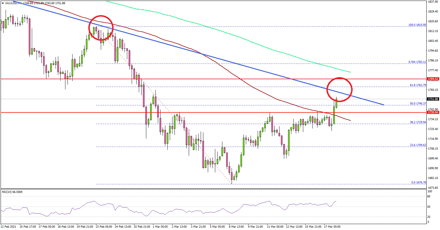 To move into a positive zone, gold price must surpass the trend line resistance and then settle above $1,765. Conversely, it could fail to continue higher and it might start a fresh decline below the $1,740 support. The next major support is near the $1,720, followed by $1,712.