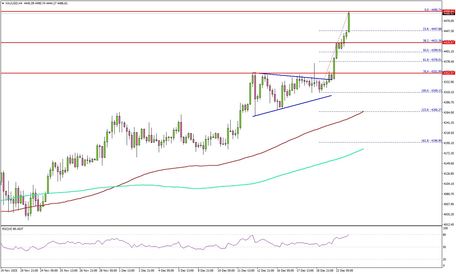 The 4-hour chart of XAU/USD indicates that the price cleared a key contracting triangle with resistance at $4,330 to enter a positive zone. The recent rally pushed the price to a new all-time high at $4,490 on TitanFX.