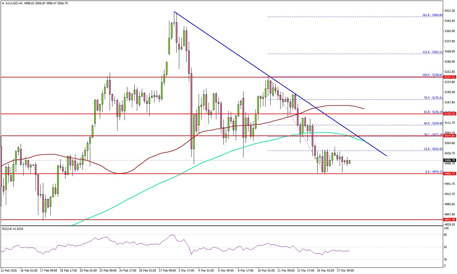 Gold remained well bid above $4,970 against the US Dollar. The price climbed above $5,150 and $5,200 before it started a fresh decline.