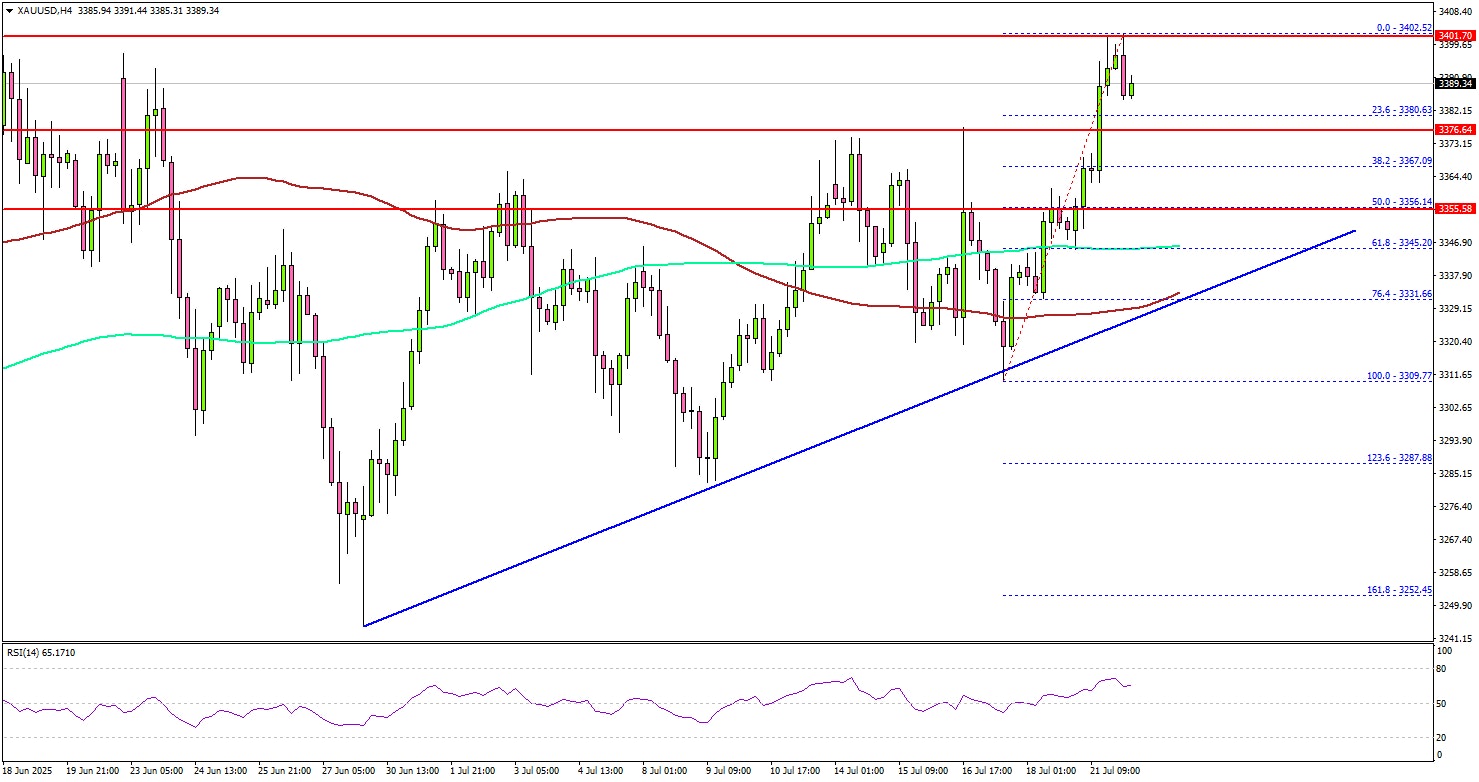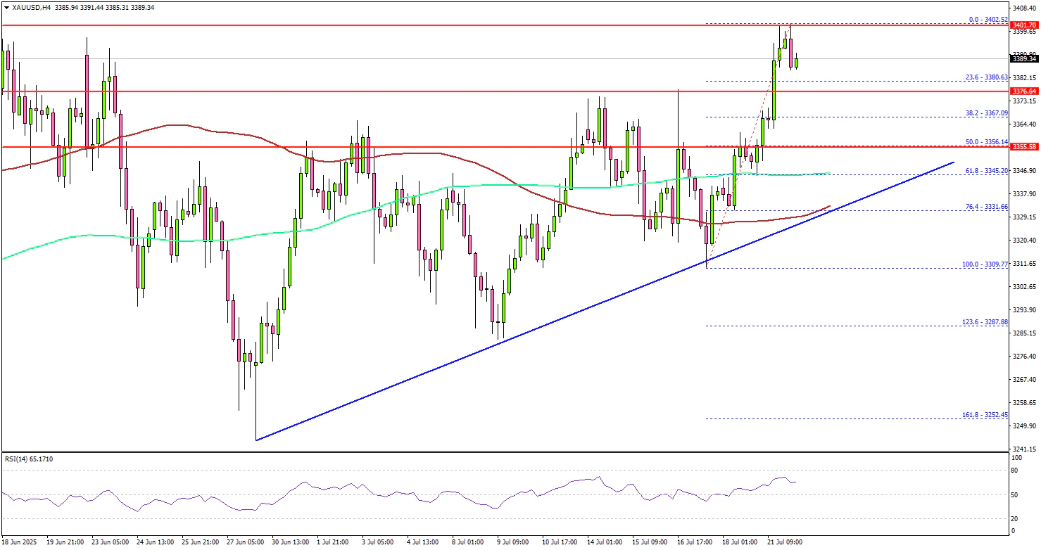 The 4-hour chart of XAU/USD indicates that the price settled above the $3,380 level, the 100 Simple Moving Average (red, 4 hours), and the 200 Simple Moving Average (green, 4 hours). A high was formed at $3,402 and the price is now consolidating gains.