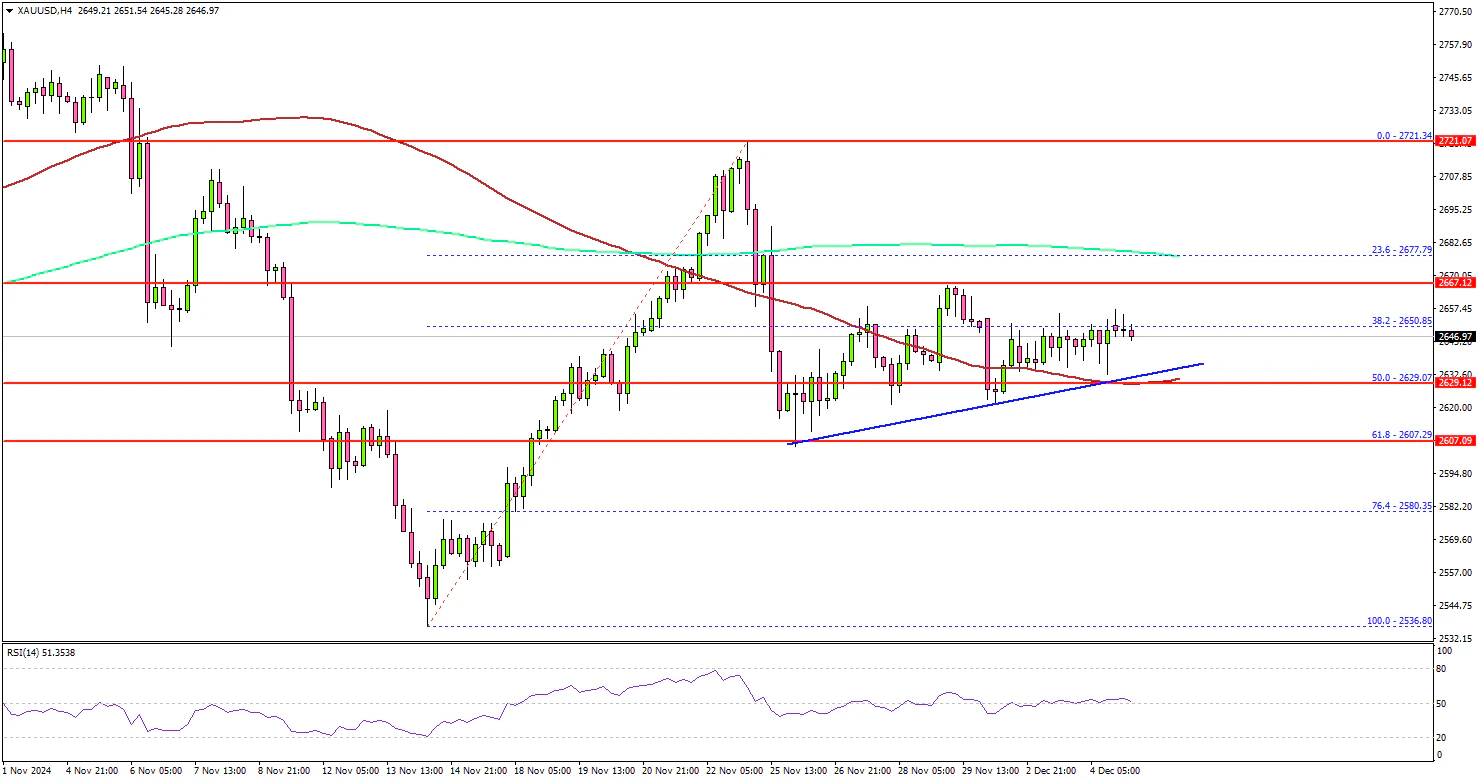 The 4-hour chart of XAU/USD indicates that the price struggled to clear the $2,665 level and corrected some gains. The price declined below the 50% Fib retracement level of the upward move from the $2,536 swing low to the $2,721 high.